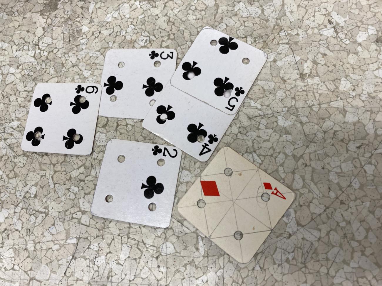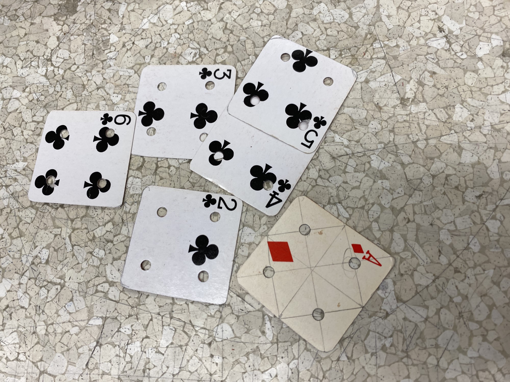 For the hem and sleeve cuff of the medieval side we used a tablet-weaving finishing technique (Fransen and Nørgaard and ĂstergĂĽrd, 2011, p. 36).3 We created our own weaving tablets out of playing cards cut into roughly 5 cm squares with holes in each corner, in a manner consistent with the archaeological evidence (Collingwood, 2015, p. 26).4 We placed the holes equidistant from each other and the sides of the card, and used a hole punch to make the holes evenly sized and smooth around the edges. We worried that the thread we used elsewhere in construction would be too thin and snap too easily for tablet weaving, so we plied threads together into a 4ply yarn using a drop spindle.