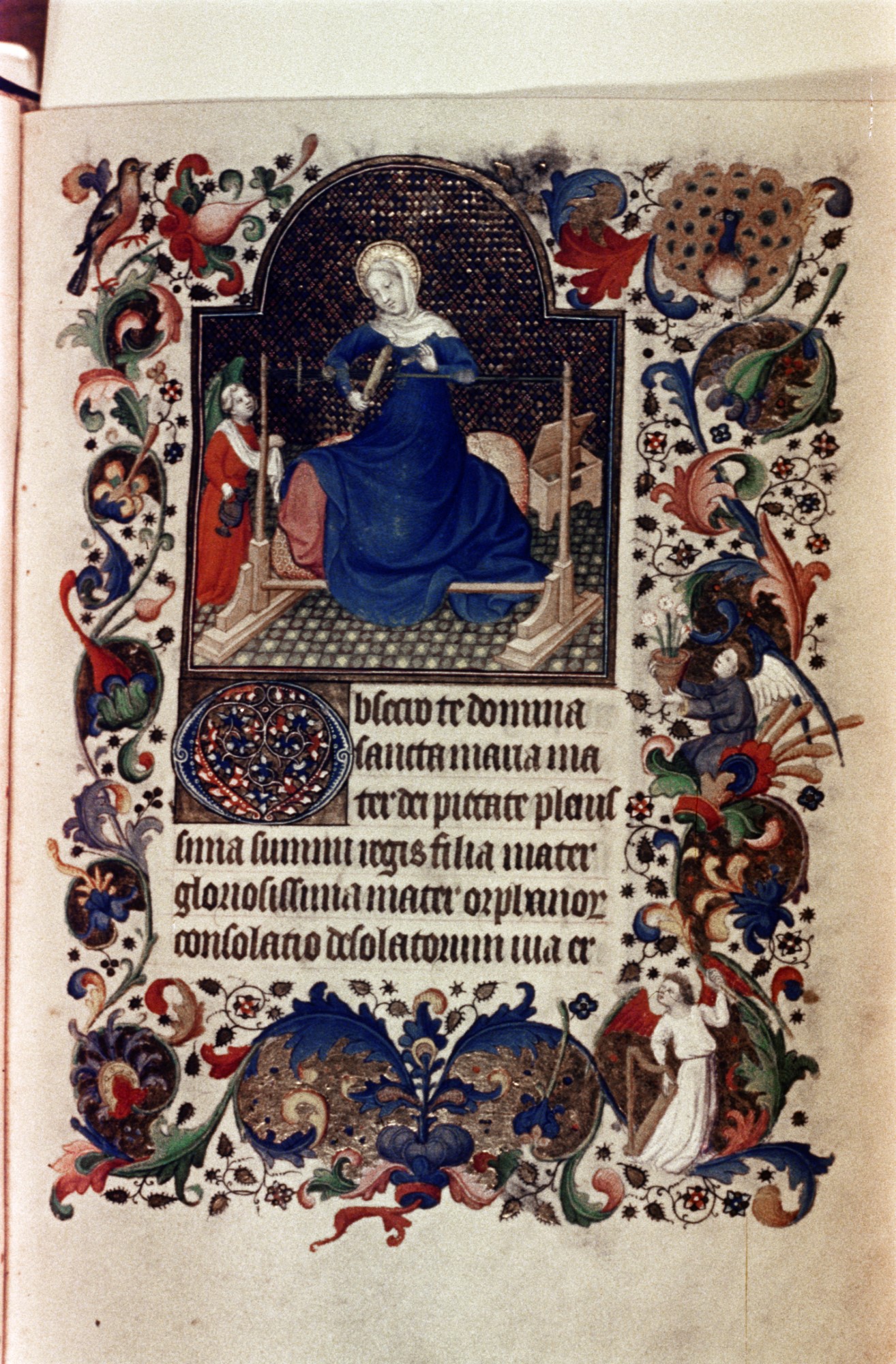 Fig 17. The Virgin Tablet Weaving. Book of Hours. Use of Paris. Paris, France ca. 1407. 19r. Bodleian Libraries, University of Oxford, Bodleian Library MS. Douce 144. https://digital.bodleian.ox.ac.uk/objects/342f4ed5-d93c-4d1b-bf7e-310c2âŚ