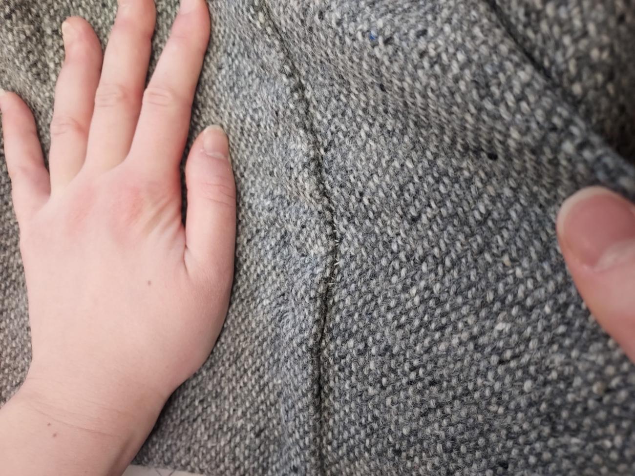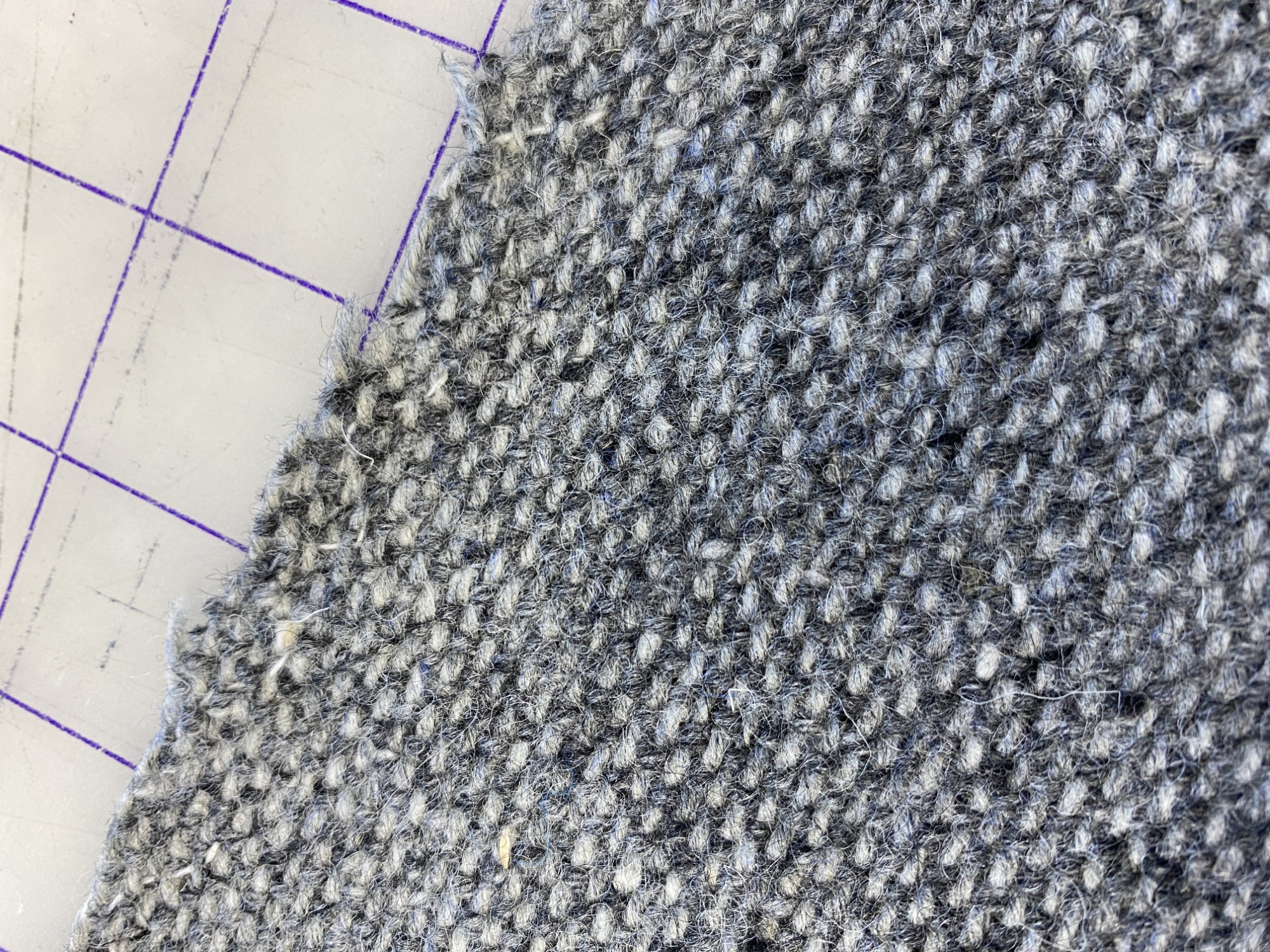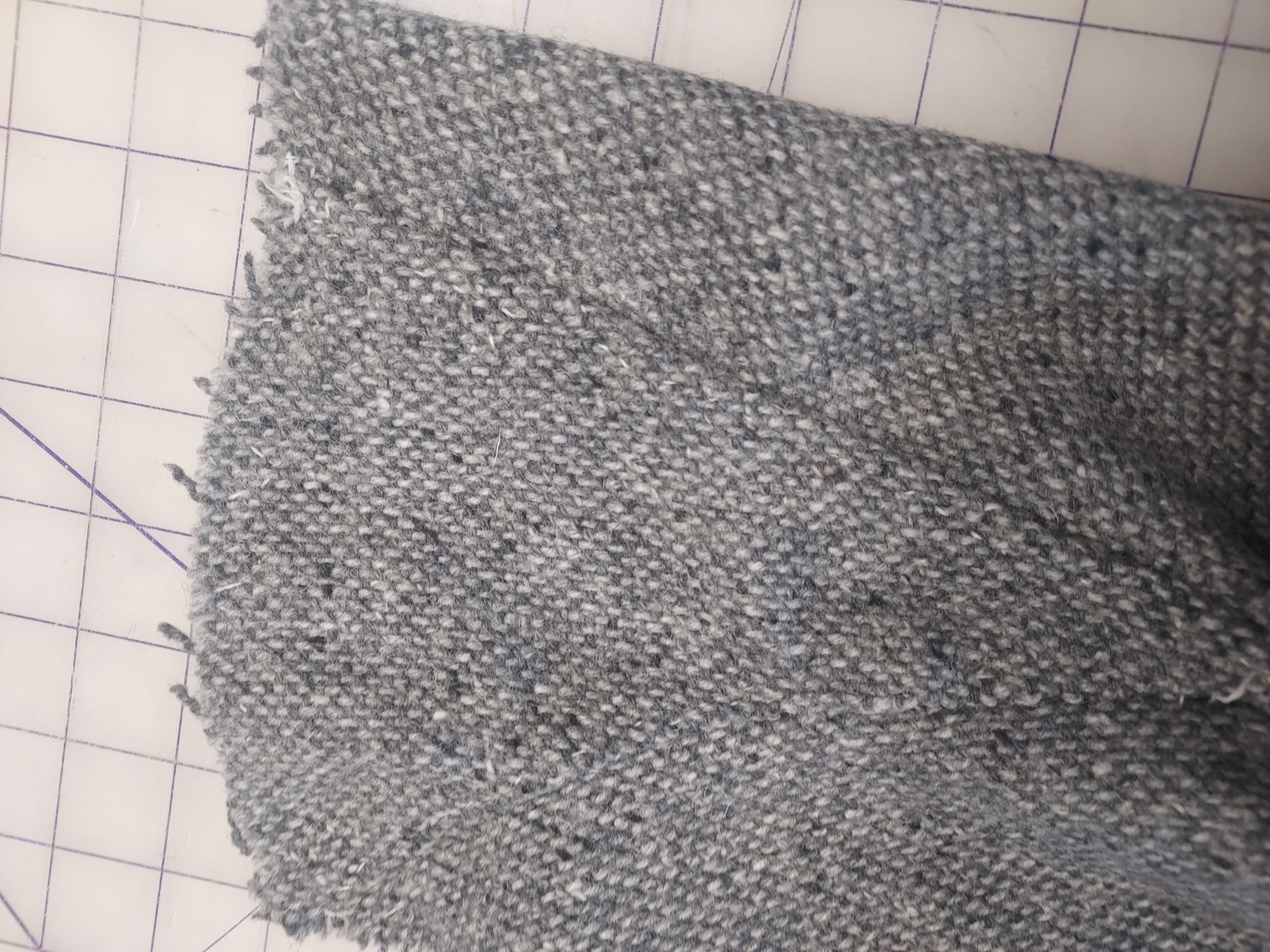 For our fabric we wanted 100% wool with a loose weave to replicate the medieval fabric. Pure wool acts in a distinct way that synthetic blended fabrics do not, and tightness of weave affects seam finishing techniques and the rate at which the fabric ravels. We used a tweed twill from Kerry Woolen Mills in Ireland, which, while slightly thicker in weave than the four shaft-twill found in most of the Herjolfsnes garments (5-6 warp threads per cm versus 8-10 per cm) it was the best approximation that we could find based on our criteria, short of weaving our own (Fransen, Nørgaard and ĂstergĂĽrd, 2011, p. 88; Sanchez, 2023).