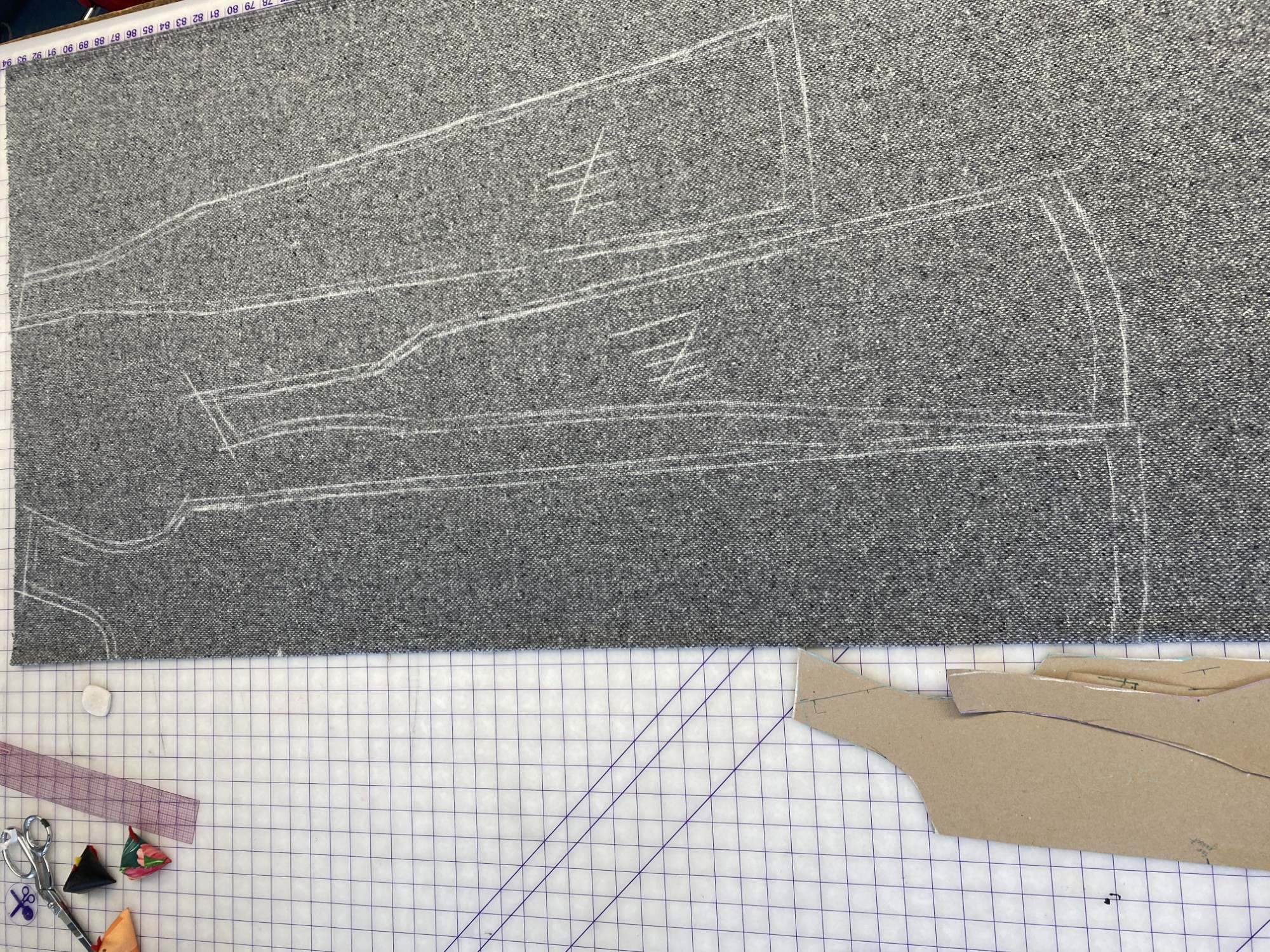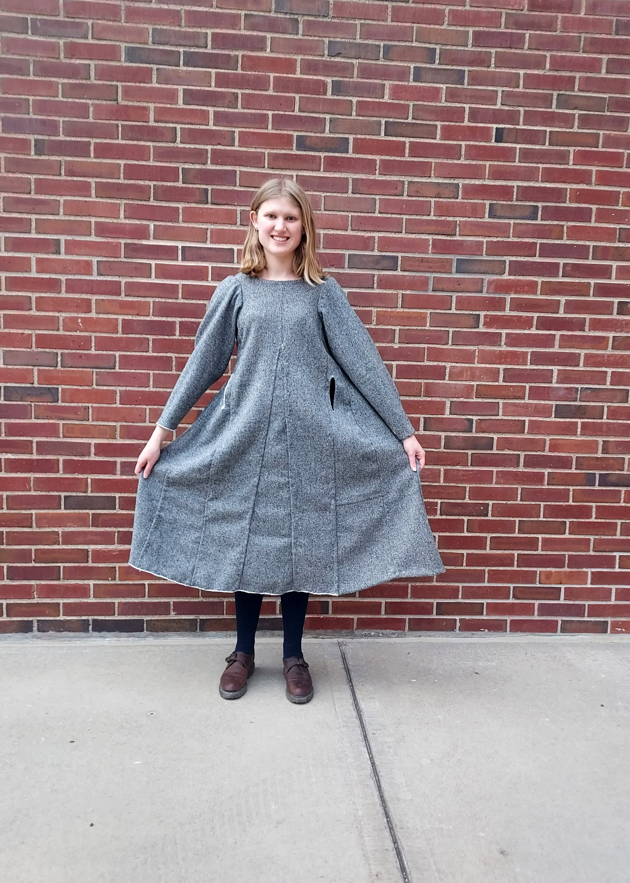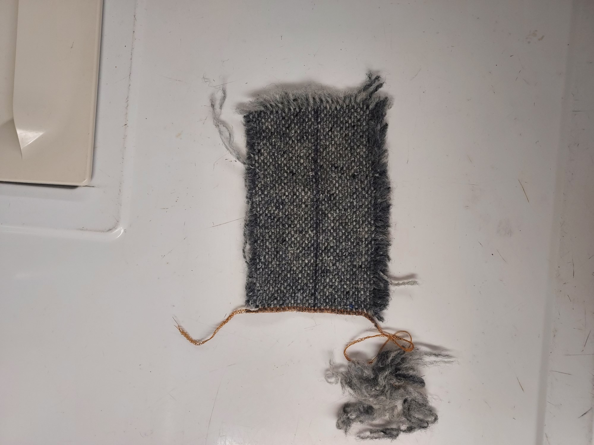 For our fabric we wanted 100% wool with a loose weave to replicate the medieval fabric. Pure wool acts in a distinct way that synthetic blended fabrics do not, and tightness of weave affects seam finishing techniques and the rate at which the fabric ravels. We used a tweed twill from Kerry Woolen Mills in Ireland, which, while slightly thicker in weave than the four shaft-twill found in most of the Herjolfsnes garments (5-6 warp threads per cm versus 8-10 per cm) it was the best approximation that we could find based on our criteria, short of weaving our own (Fransen, Nørgaard and ĂstergĂĽrd, 2011, p. 88; Sanchez, 2023).