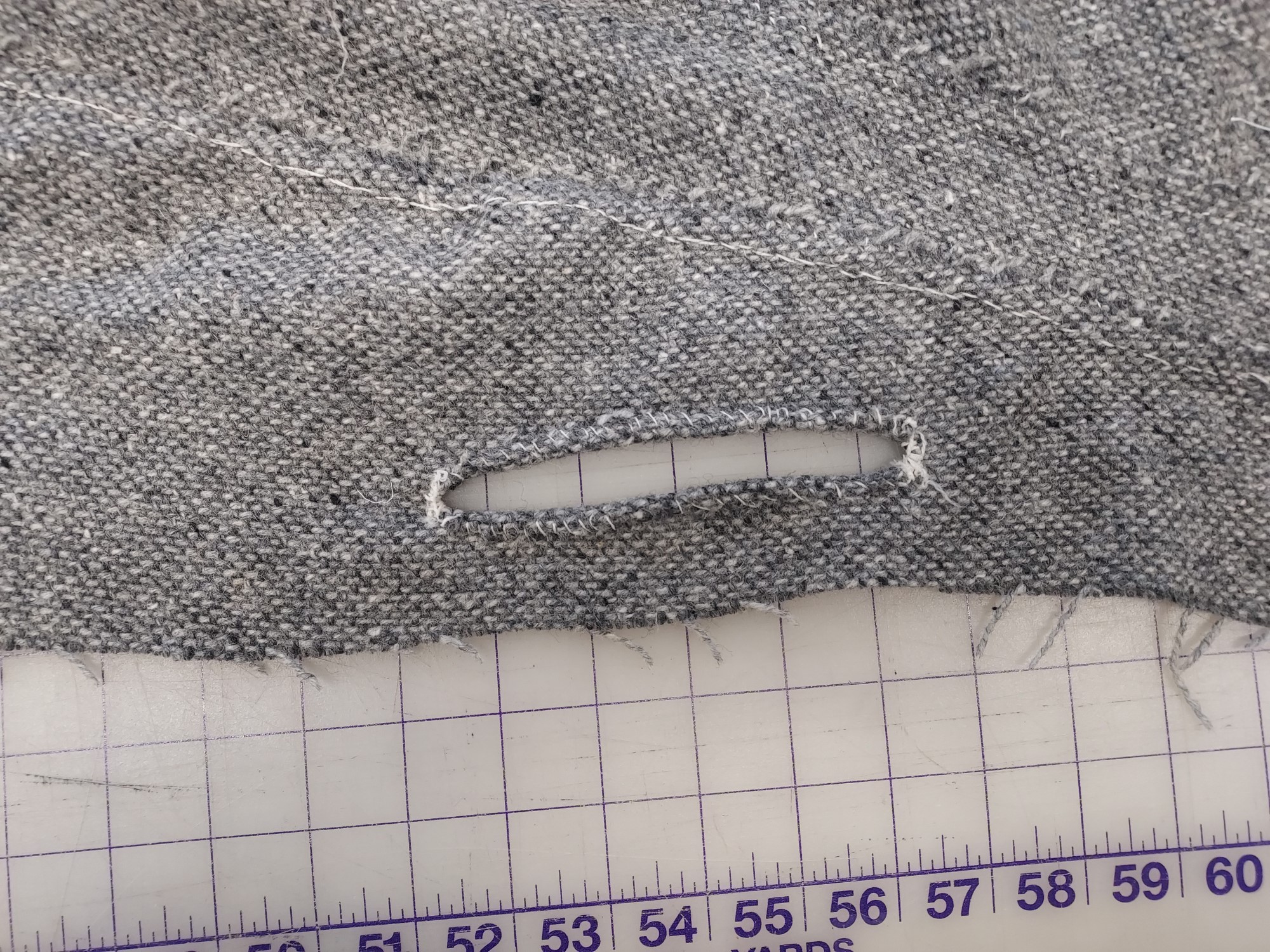 For the pocket on the modern side, we cut the slit in the fabric as marked on the pattern. We then turned both sides back to the inside of the garment about 0.64 cm. We tapered this down to nothing on either end of the pocket slit to avoid awkward pulling and having to cut into the fabric more than necessary. The turned back fabric was then stitched down using the same overcast stitch that was used to finish the seams. Since this left the ends of the pocket slits as raw edges, we used a buttonhole stitch to cover and protect that part of the fabric (See Figure 22).