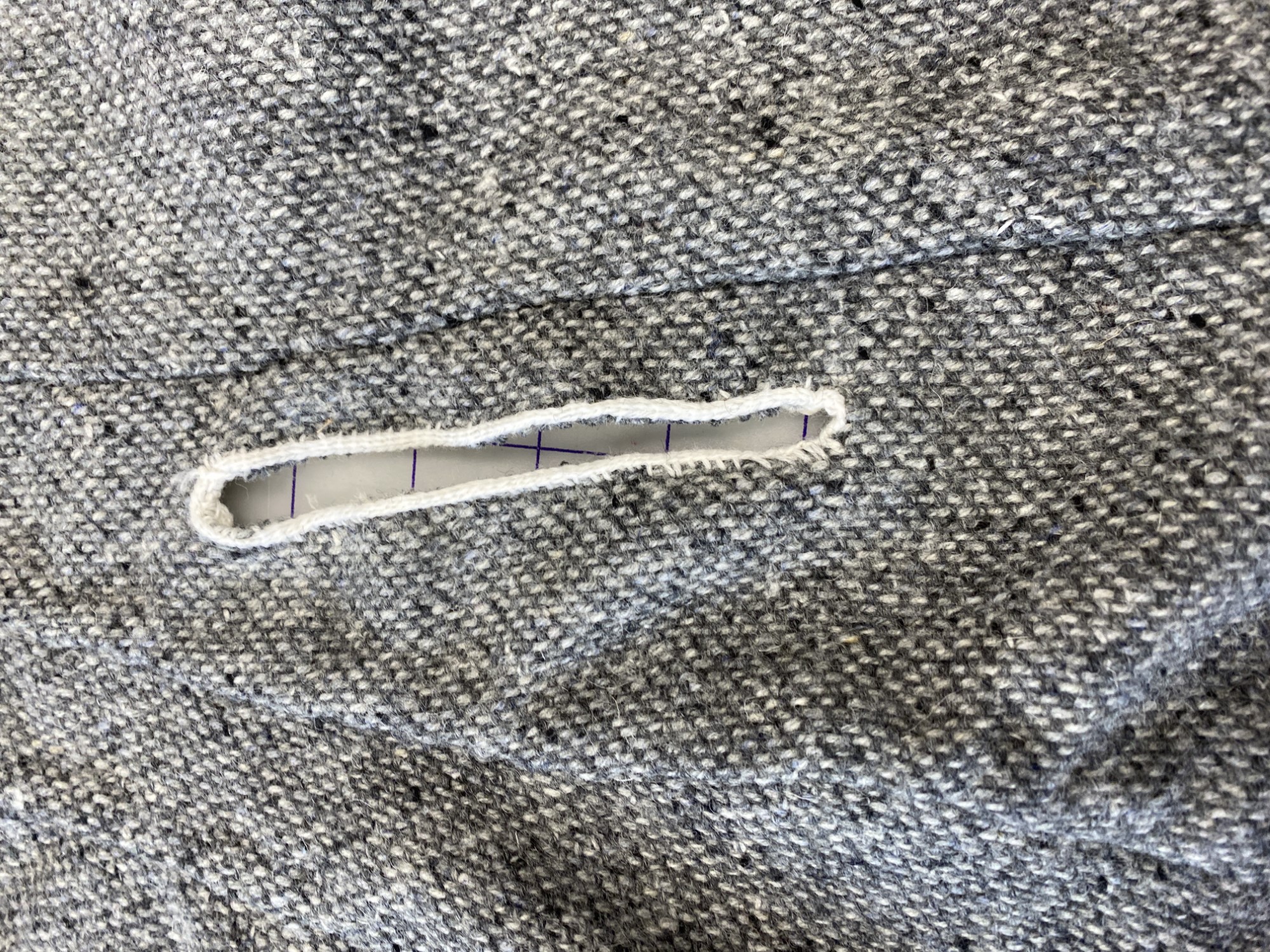 This method resulted in a bulky pocket that gaps open because we removed about 1.25 cm of fabric from the garment. Ironing it may have improved its aesthetic shortcomings. We are unsure about the longevity of this method of finishing the pocket because the fabric is only turned back once and secured with a hand overcast (See Figure 23), and this part of the garment would get significant wear from moving your hand and objects in and out of the pocket. Thus, the edges of the fabric could still fray especially with heavy use.7