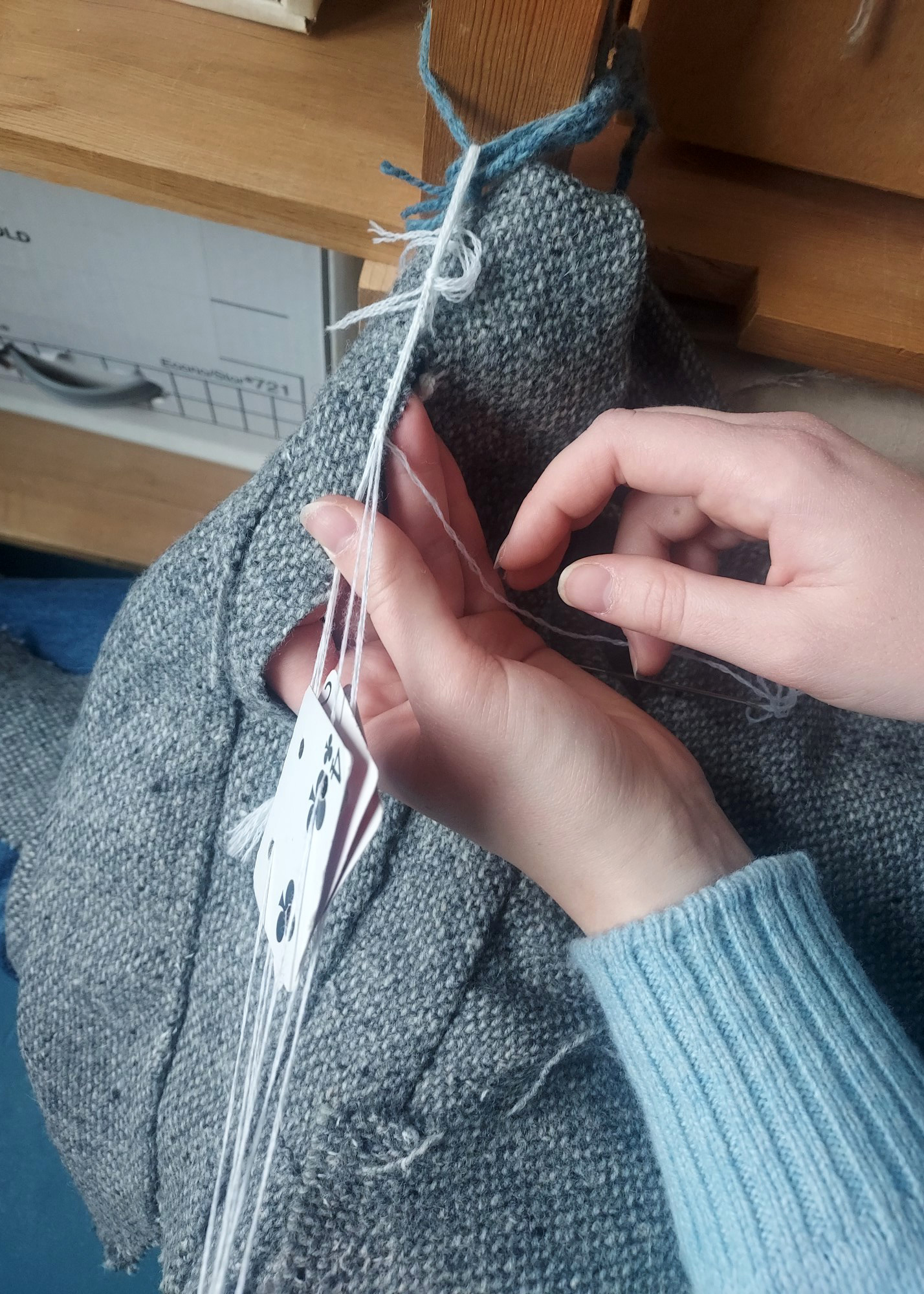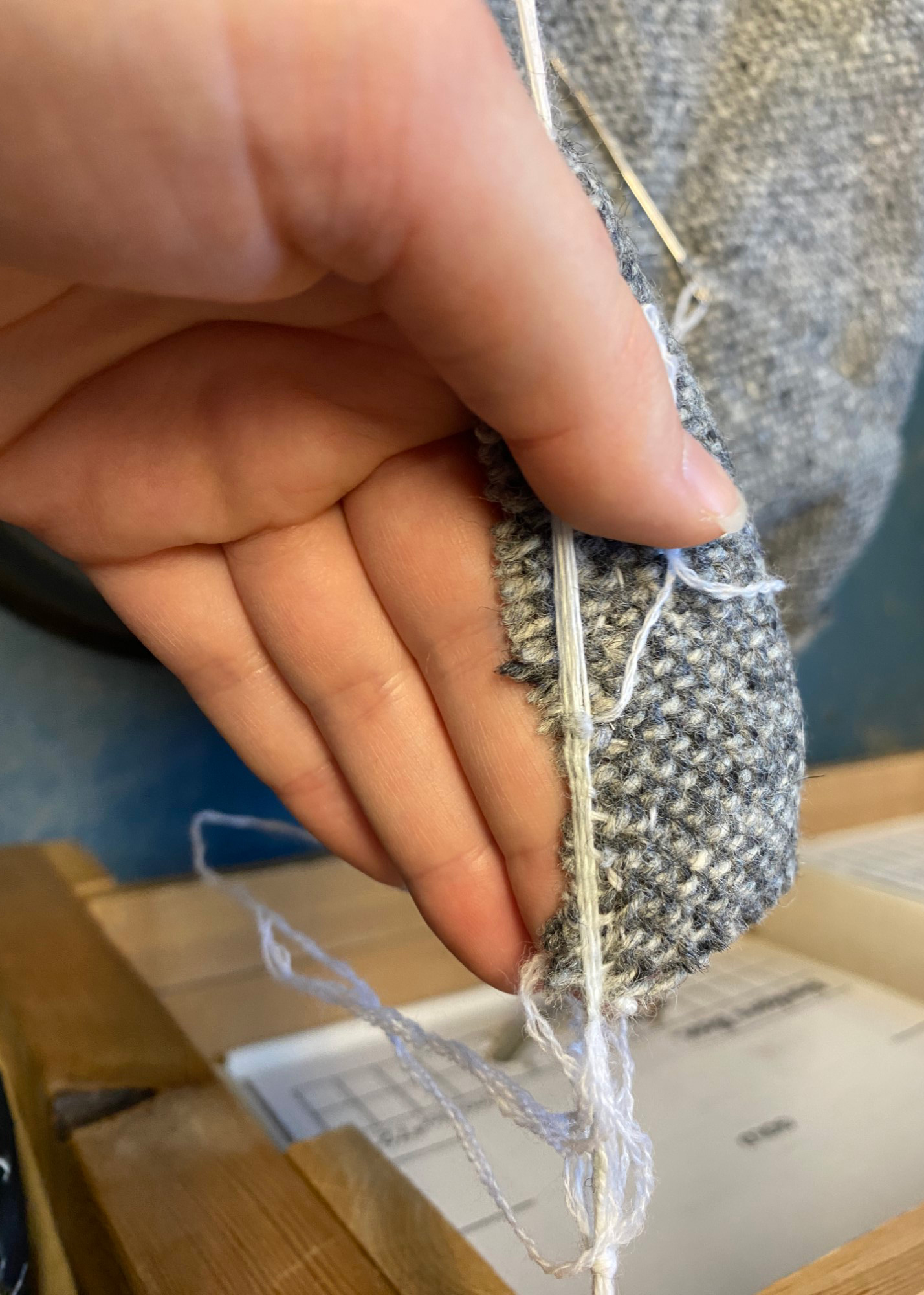 We found sewing the singling onto the garment to be an intuitive and simple process. We eyeballed the seam allowance instead of measuring precisely, as it is more efficient and just as practical since the singling gets incorporated flat into the fabric. We stitched from the wrong side, that is with the wrong side up, as that is the side with larger and more visible stitches. This effectively secured the individual threads to each other and made it difficult for the fabric to fray out in large quantities. In some ways this was like pre-emptive darning as we sewed the weave of the fabric together so that it held to itself.