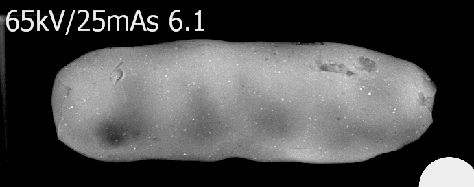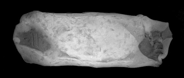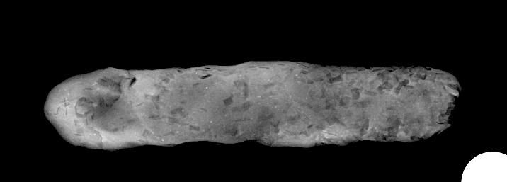 As regards folded tablets, the multiple folding actions and the subsequent smoothing of the edges and joints make it difficult to detect directionality of the rolling pin. No pattern can easily be discerned on the X-ray (See Figure 10). Whether or not the clay ball was first shaped into a coil cannot be detected by X-ray.