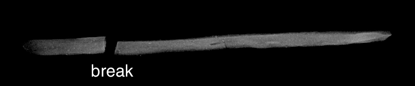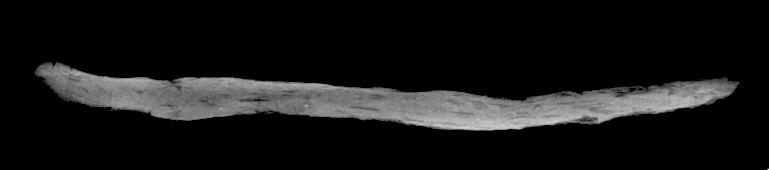 The top-down X-ray view of the simple tablet shows a random orientation of the straw inclusions and a parallel alignment to the surface for the side view (See Figures 14-15). This is entirely in line with what we would expect based on our knowledge of pottery-forming techniques. The physical pressures exerted when making a tablet are similar to mould-made or pinched pots, which show an equivalent orientation in X-rays (See Figure 1). The top-down view of the folded tablet also shows a random orientation of the straw inclusions. Unfortunately, the side view is difficult to interpret due to the various folding layers (See Figures 16-17).