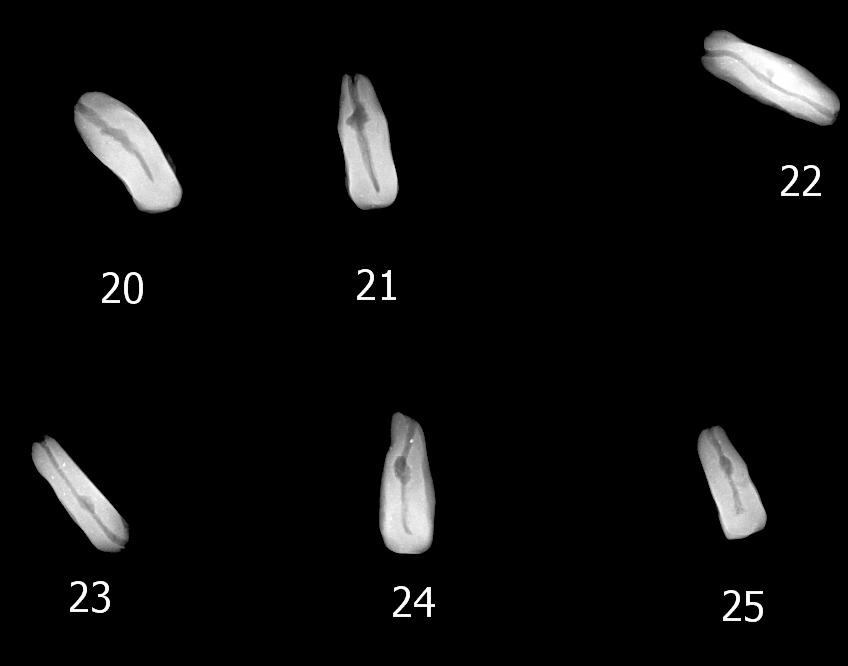 As expected, the existence of string and knot is clearly visible on the X-rays (and would be equally visible if the string had burnt out from exposure to fire and had left a void behind) (See Figures 5-6, 21-22). The frequency of knotting is hard to discern and it impossible to distinguish double knots from single knots. Twisted string can be visualised satisfactorily. Thus, the experiments have shown the potential of X-radiography in revealing the 'content' of intact hanging nodules.