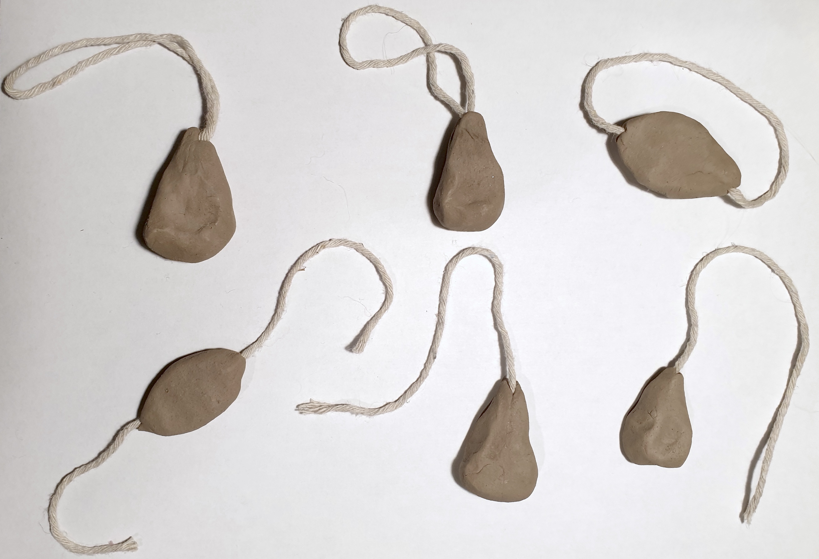 A hanging nodule is a simple piece of hand-formed clay that is squeezed around a plain, twisted or knotted string. The great range of string-knot arrangements used in the past was revealed by Montecchi (2017) who analysed silicone casts of broken hanging nodules kept in the Corpus of Minoan and Mycenaean Seals archive and identified at least four different arrangements: 1) nodule over a single knotted end of a string; 2) nodule over the length of a single (at times knotted) string; 3) a nodule over the two loose ends of a string; and 4) a nodule over the two twisted ends of a single string. Unlike the examples in the archive which were broken, many of these administrative clay objects have been found intact with the string burnt out following an accidental fire that turned the artefact into fired ceramics. Therefore, this experimental study was performed to determine whether the type of knot (single or double), the number of strings (one, two) and their arrangement (simple, twisted, knotted) can be visualised with X-radiography non-destructively (See Figures 5-6). The clay was allowed to air-dry before X-rays were taken. Because of the different radiodensity of clay and string, one would expect the string and knot to be clearly visible on the X-ray. Future experiments may wish to investigate whether different string materials could be visualised accurately by X-ray.