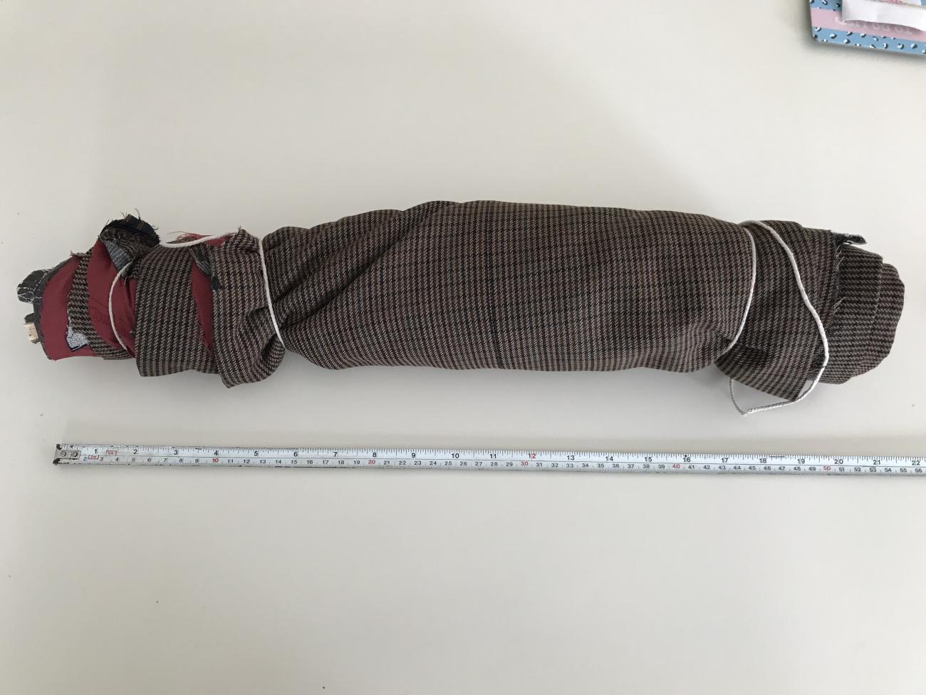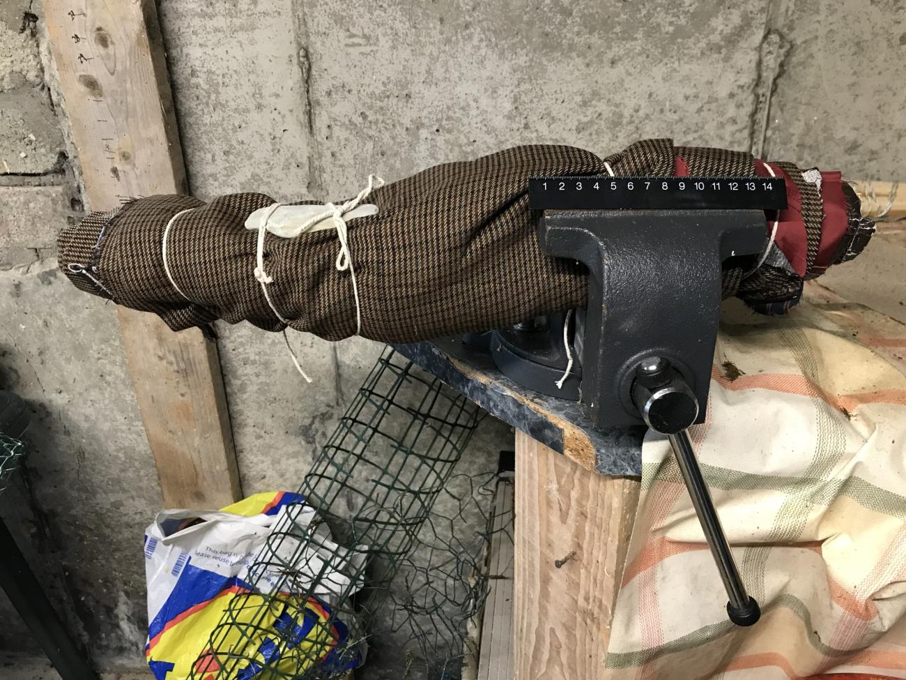 To establish the plausibility of this thesis, a scoping experiment was undertaken by the present writer. It was decided that a rough replica of a bow arm, as it was being held rigid holding a bow, could be approximated by robust twigs, wrapped in strong fabric and held in a vice grip. Two freshly cut sticks, roughly the size of the bones of the forearm, were bound individually, and then together to replicate a forearm (See Figures 6 and 7). The replica arm was then supported at one end in a bench vice. As this was intended as a scoping experiment, it was not thought necessary to reproduce known wrist guards, only to ensure that the stone replicas were at least as robust, if not more so, than know wrist guards. Six stones of various kinds, approximately the size of the wrist-guards on display in the National Museum of Ireland, were located at the mouth of a stream near Blackwater, Co. Wexford. Each, in turn, was attached to the replica arm to make an armature which would roughly replicate the wearing of a wrist-guard on the outer forearm (See Figures 8, 9 and 10).