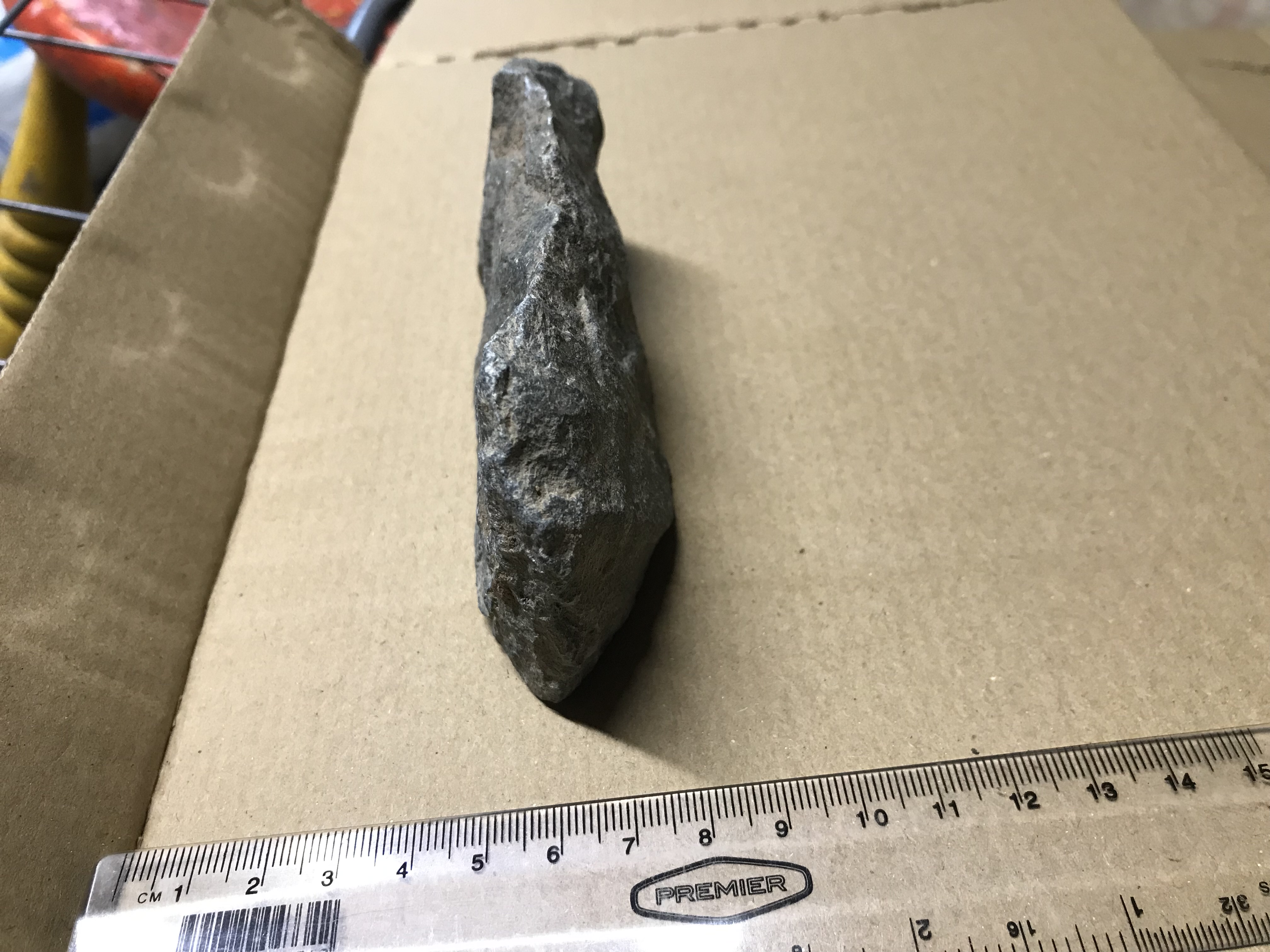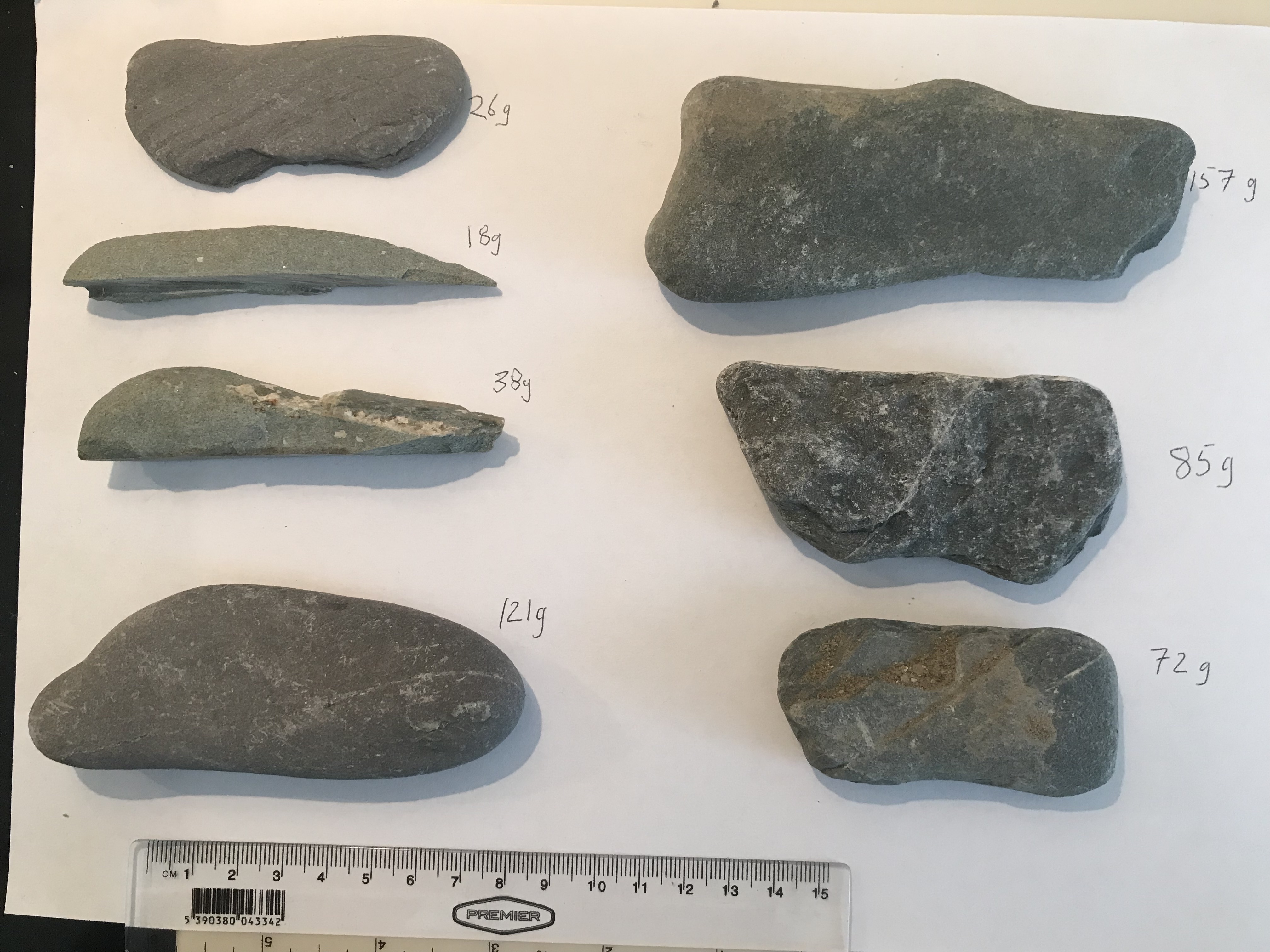 The possibility then arose that the stone wrist guards were vulnerable to metal blades but might be protective against stone weapons. It was decided to repeat the tests but with a proxy for a prehistoric stone knife or dagger. In this experiment, six stones of approximate size to the wrist-guards, and one much larger for comparison, were picked on a beach (See Figure 11). As can be seen from the illustration, they are of widely different shapes and sizes. The largest, 157g, could not possibly be worn on the arm except in extraordinary circumstances; the others seemed more plausible.