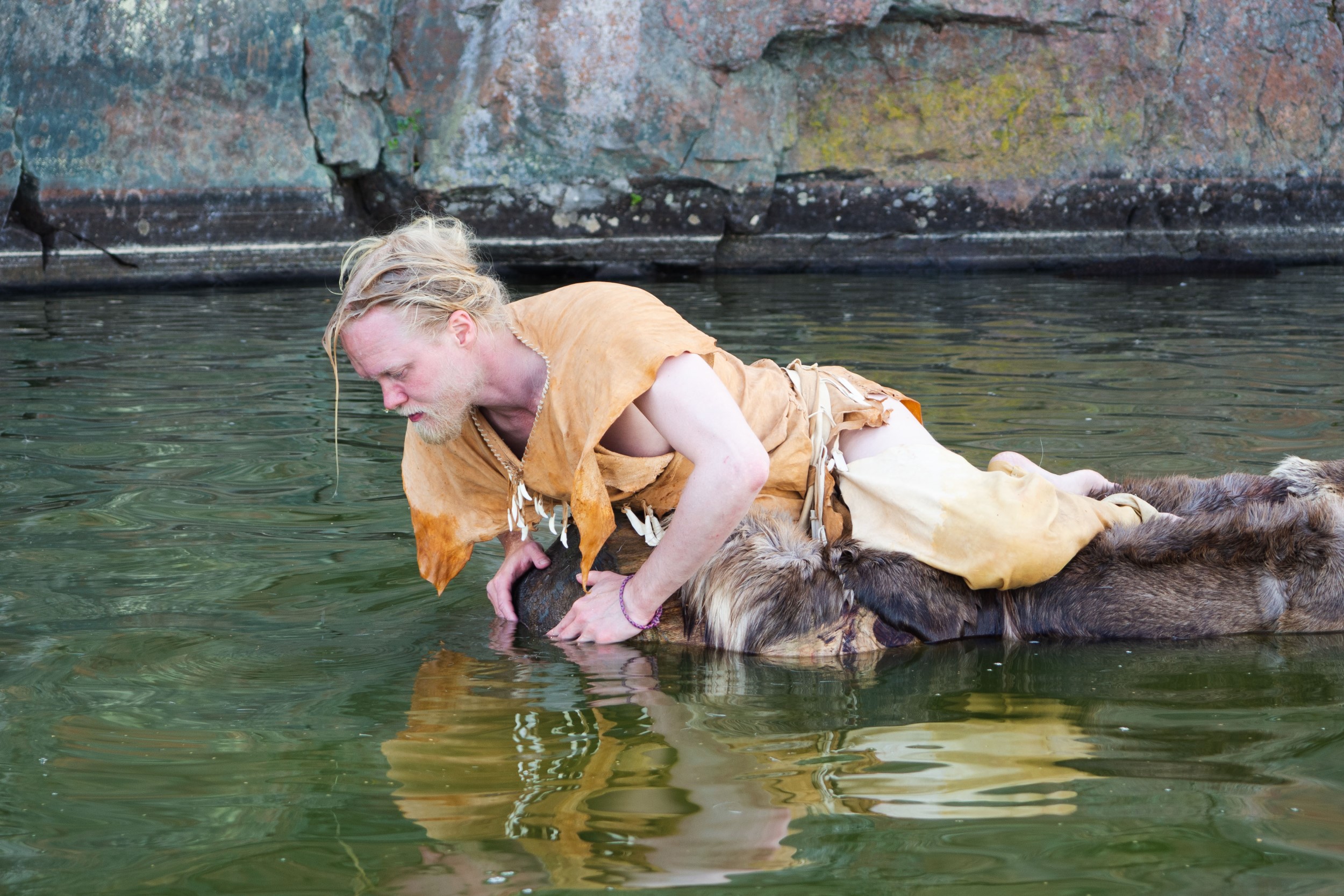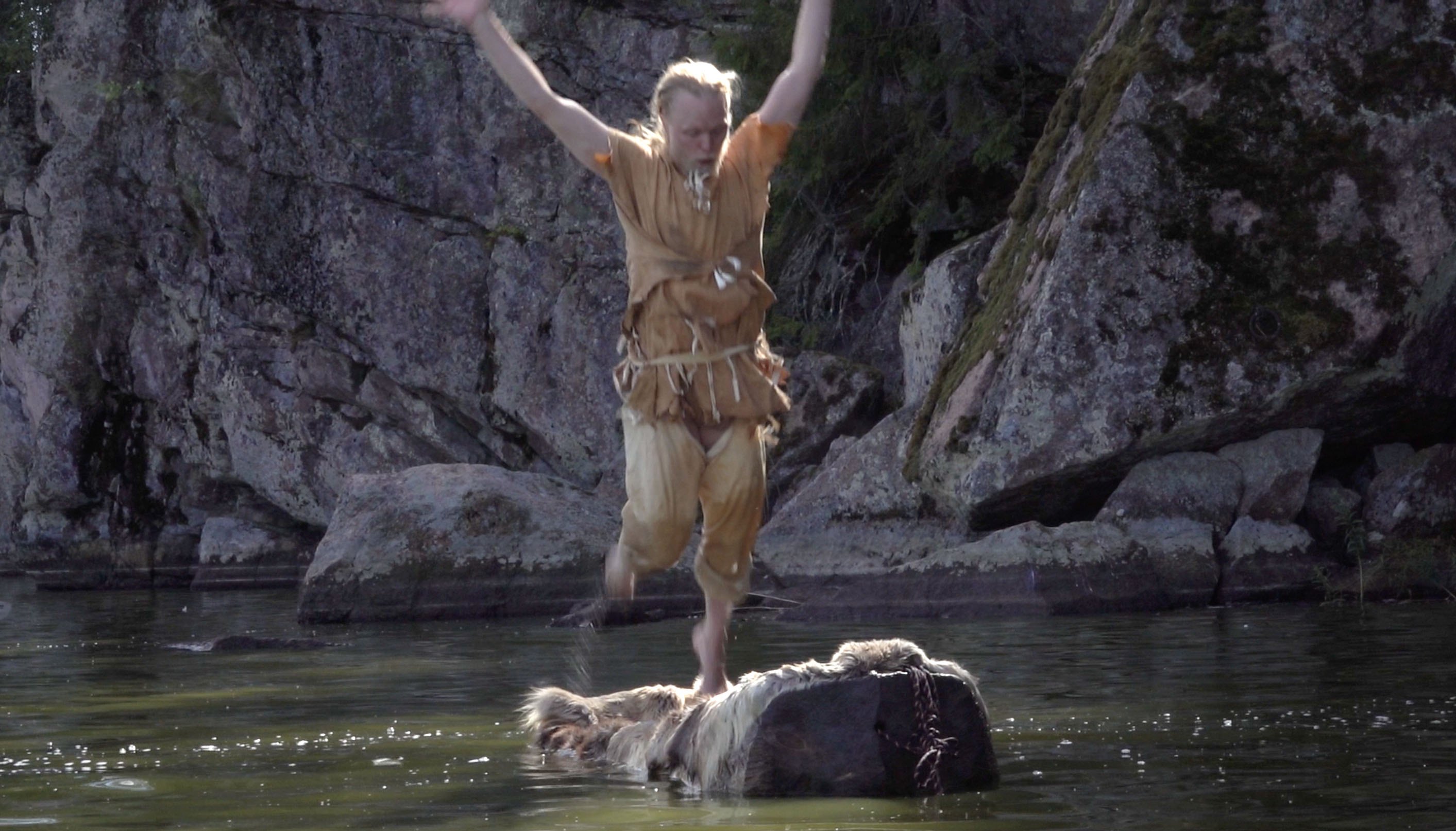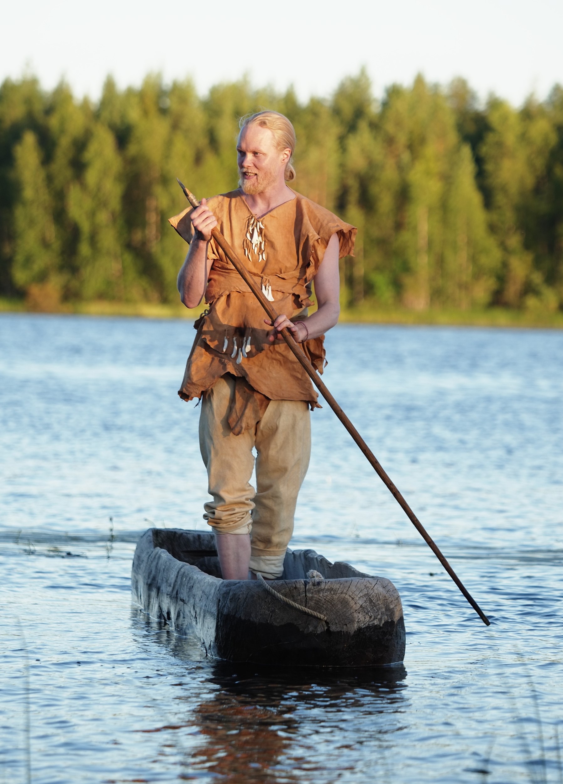 This article reports on an artistic-scientific experiment inspired by such Northern European rock art, in which dancer Arttu Peltoniemi spent a few months working in and with a Stone Age style dugout canoe, creating an artwork called the Dug Boat Dance (Ruuhitanssi). The Dug Boat Dance was performed in a reconstructed Mesolithic-Neolithic -style outfit at the rock painting site of Salmijärvi in Finland (See Figure 2). The research questions of the experiment included: 1) Is it possible to dance in a boat? 2) What kind of movements and bodily sensations does dancing in a boat, on an unstable rocking platform, produce? 3) Is it possible to gain information about the dance practices and rituals of the past through the bodily experiences of a contemporary dancer? Since the Dug Boat Dance was a unique project in concept and execution - possibly even the first of its kind worldwide - we report its results in this article based on Peltoniemi's interviews.