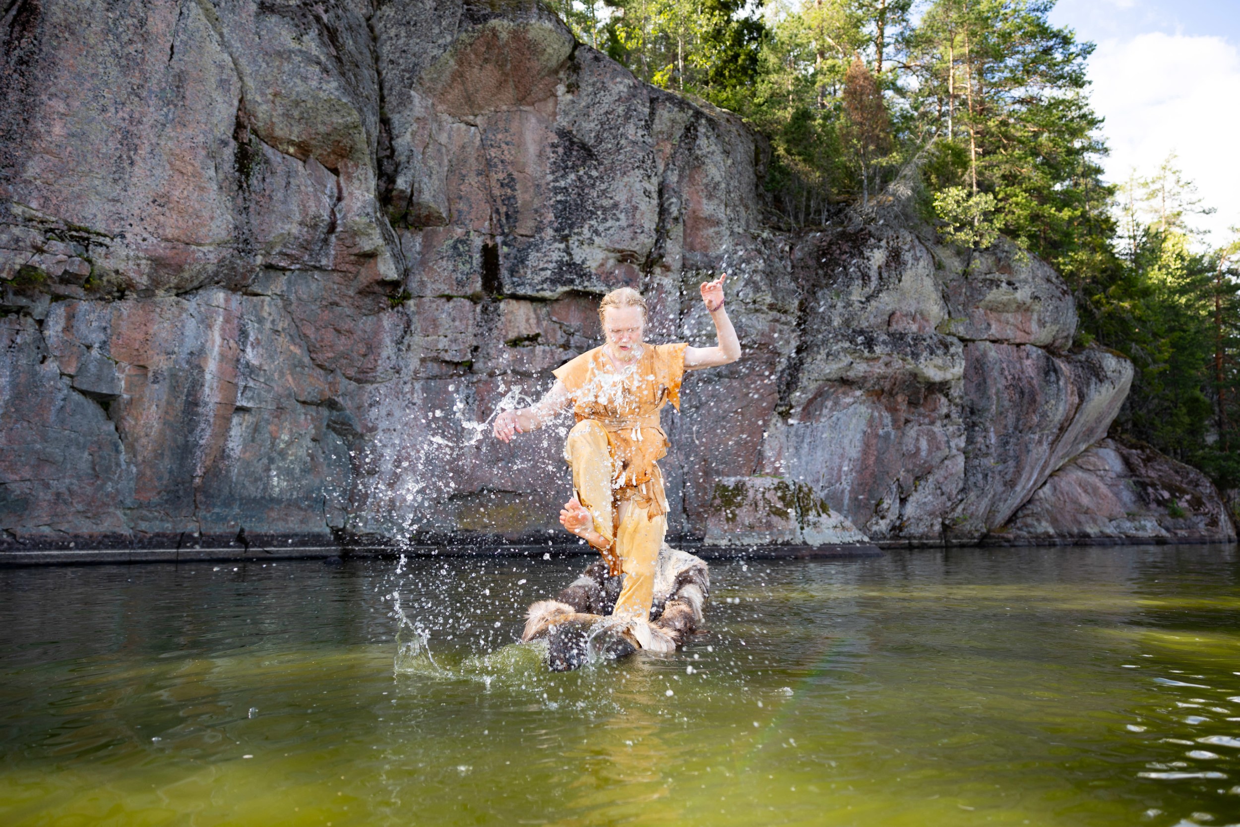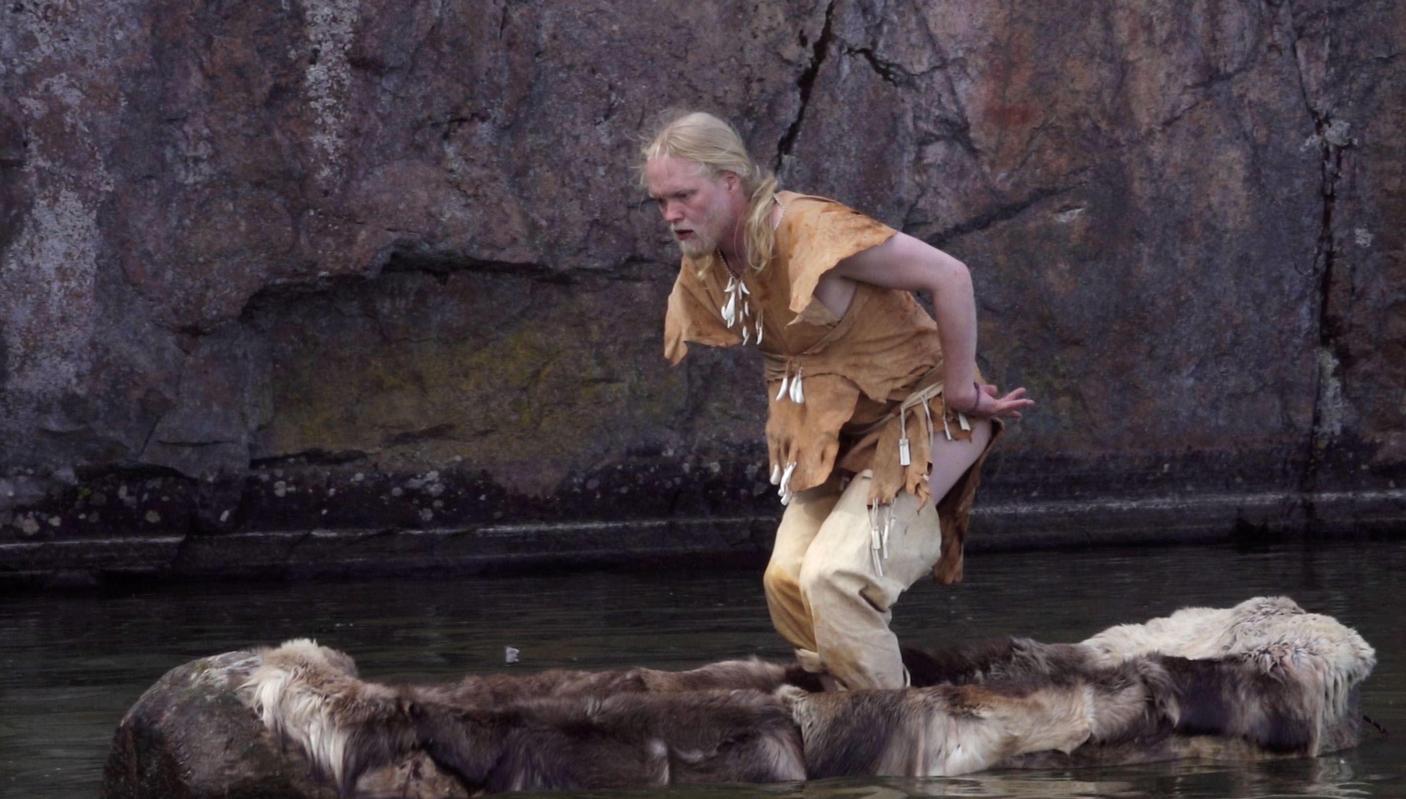 In his performances of prehistoric dance, working without musicians, Arttu Peltoniemi usually gives sonic support to his movements with simple, animal-like calls and sounds, as well as slaps and taps he makes himself. In the Dug Boat Dance, new sound elements were included:
