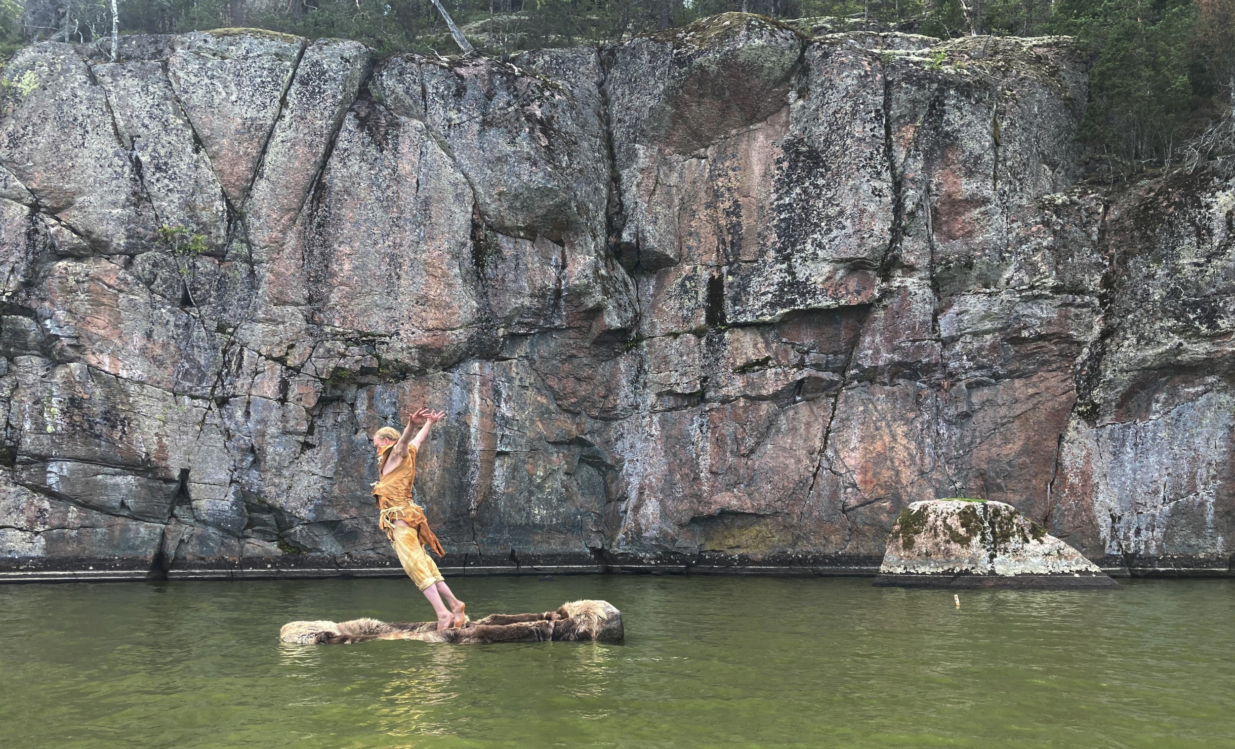 At the outset, the rock art-related movement material produced for Peltoniemi's previous works was of no use, because the training had to start by getting the nervous system and musculature used to being in the canoe. The methods used consisted of dance and movement practices influenced by somatics, where the term soma refers to the body as perceived from within (e.g. Hanna, 1986; Tuominen, 2020). In a practice called Contact Improvisation (CI), movement is explored through physical awareness: the sensations of weight, balance, spatial orientation, touch, inertia, and so on (e.g. Paxton, 1975; Novack, 1988). If the exercise is done solo, the practitioner stays still and allows the body to make movements that arise in that particular moment and situation. In a practice called Authentic Movement (AM), bodily movements and sounds are understood as responses to psychological processes (e.g. Wallock, 1981; Barkai, 2022). The practitioner moves free from intellectual directives or expectations, allowing the internal impulses arising from the situation to create the dance. In addition to these exercises, Peltoniemi practised falling out of the canoe using safety equipment, such as a life jacket, helmet, and insulated overalls. A long wooden stick that could reach the sea bottom also served as an aid. In the final stages he invited dancer Taru Koski and musician Anniina Veitonmäki to rehearsals to help design the dance work. Jenni Sahramaa conducted the first 30-minute interview with Peltoniemi for the purpose of writing this article during the training.