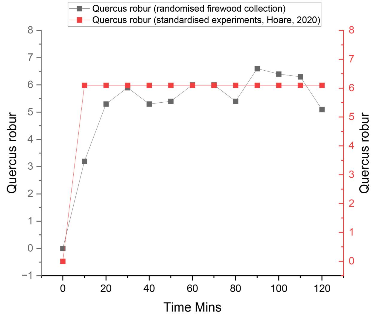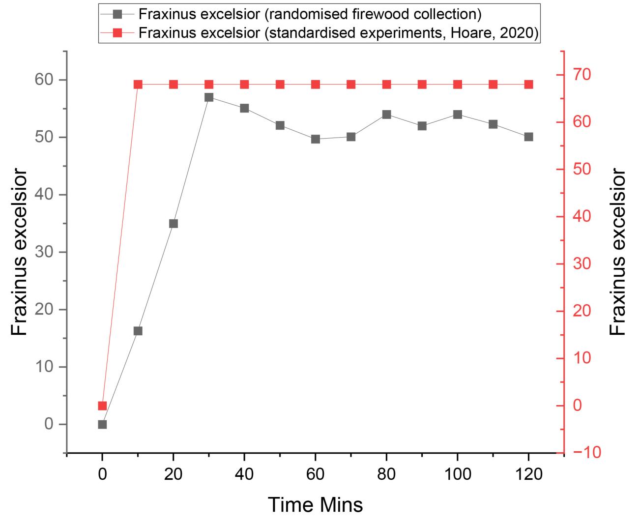 The results of this study quantified the outgoing light properties of seven experimental fires, each using a different wood species and employing a randomised firewood collection strategy (no controls on the size, state or moisture content of the wood). The study also used a flat hearth design rather than a pyramid stacking design. Analyses of the hearth temperatures were also quantified in tandem with lux measurements. The aim was to examine whether the variation in illuminance observed between individual wood species during standardised experiments with set protocols (concerning the size, state and moisture content of the firewood, e.g., Hoare (2020) could be replicated using a firewood collection strategy and hearth design more representative of prehistoric hunter-gatherers.