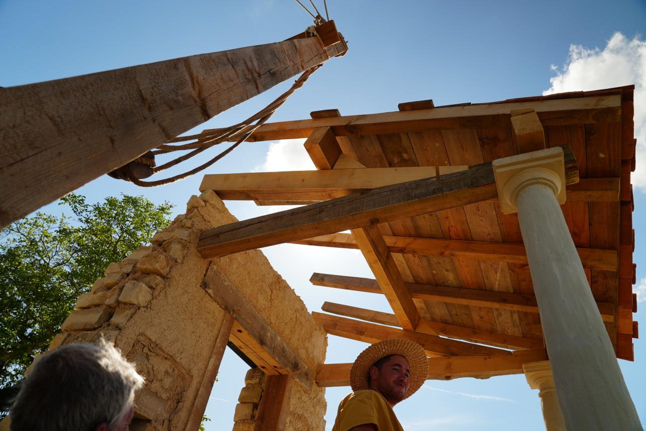 As part of our participation at the event, we wanted to create an experimental novelty around the project. This time, we would have to build an entryway and a small portion of a roman portico, such as can be found along the main road of the hilltop settlement. The portico needed to include two finished columns, supporting a full-scale carpentry, i.e. a semi-truss frame. The latter would receive a row of roman tiles, which would have to stay into place without any means of fixation, as was generally the case during the period. The entire building would then be plastered and painted, including minute geometrical decorations inserted in the walls. While it is possible that these porticoes would constitute roofed galleries, they would also have supported the upper levels of houses (see (Olivier 2021, 260‑61).