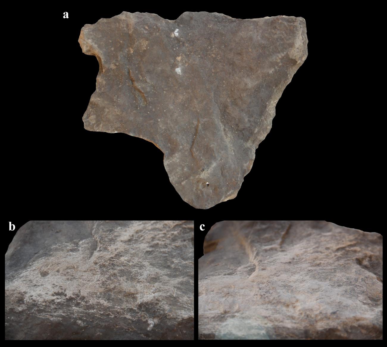 A particularly significant find was a separate rock fragment bearing linear marks, which was discovered within the Upper Palaeolithic cultural deposit (See Figure 2). According to Zamyatnin, the fragment features two intersecting lines and an extensively scraped surface, as does part of the shelter floor (Zamyatnin, 1937).