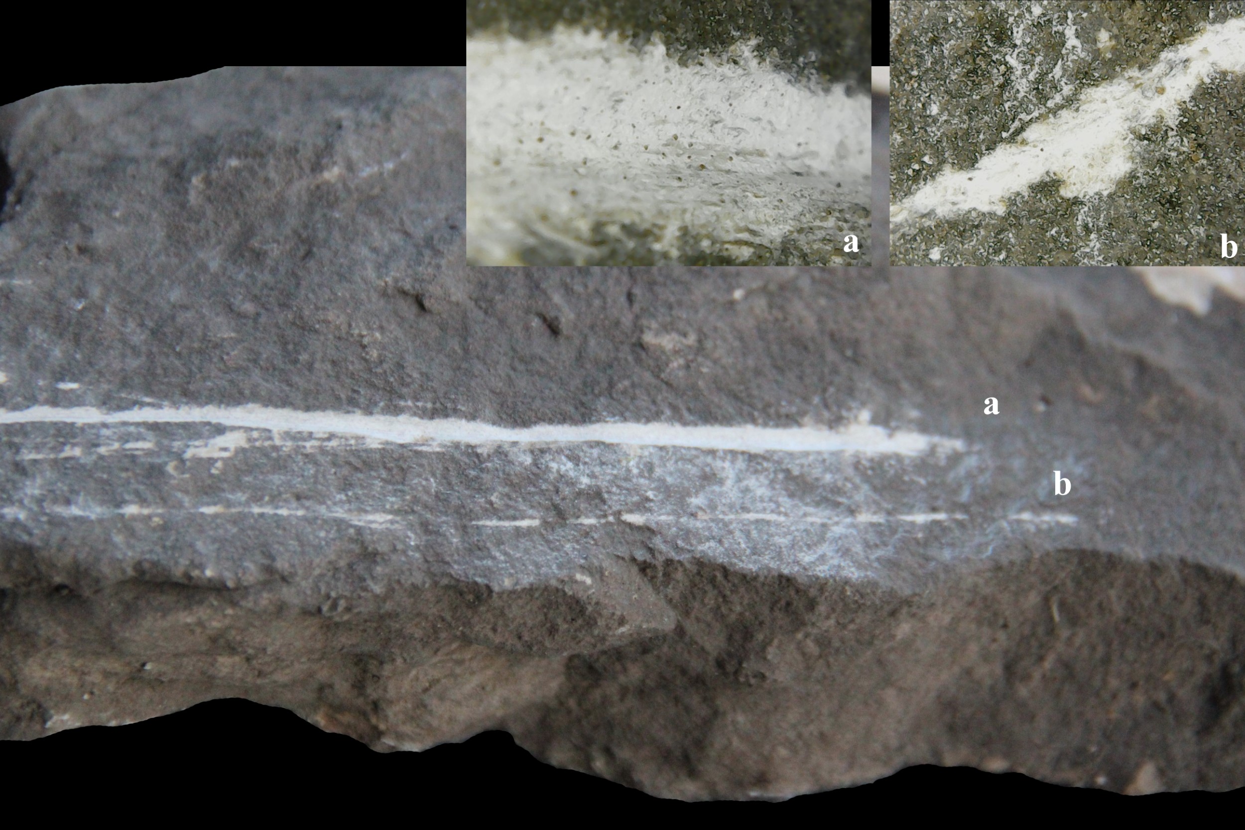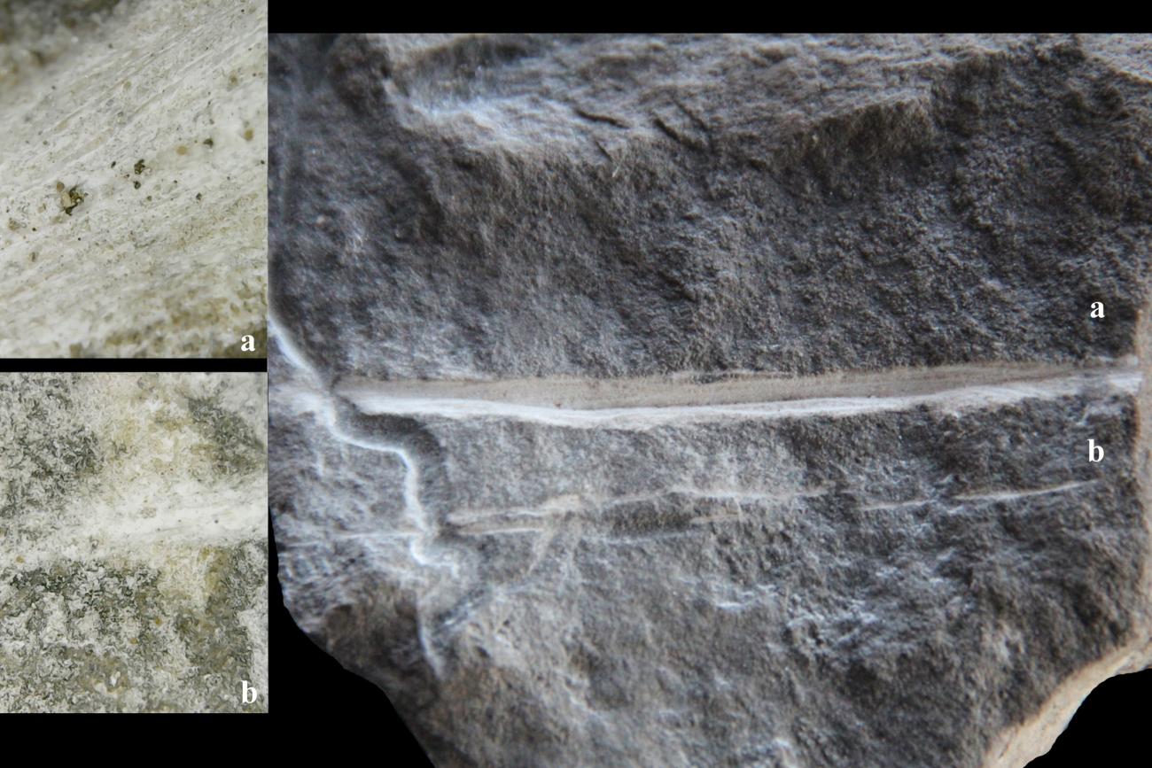 The skin-cutting activity left wider and deeper striations, as it required greater application of force. The grooves have V-shaped sections with micro-striations on the valley (See Figure 14). The resulting traces on the rock board were markedly different from those produced in previous experiments and were clearly visible even to the naked eye.