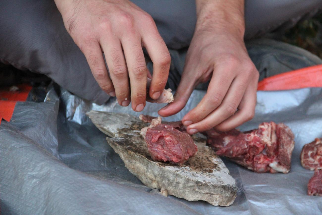 A piece of beef was cut on the unworked rock surface (Experiment No. 6) using the sharp, unretouched edge of a flint flake. The tool was moved in a unidirectional motion, whereas pork cutting had been carried out using both Uni- and Bidirectional movements. A duration of 24:03 minutes was sufficient to complete the activity and acquire 22 beef cubes.