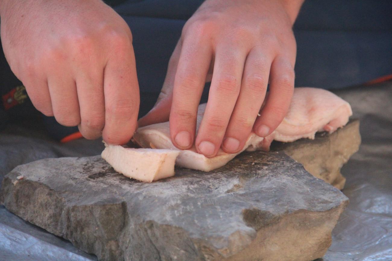 The final cutting experiment was performed on a hard material - a pork skin (Experiment No. 2), which was cut into 13 cubes on an unworked rock board using a previously utilised flint flake (See Figure 8). Bidirectional movement of the tool was the only motion employed in this activity, as it is more effective for cutting harder materials.