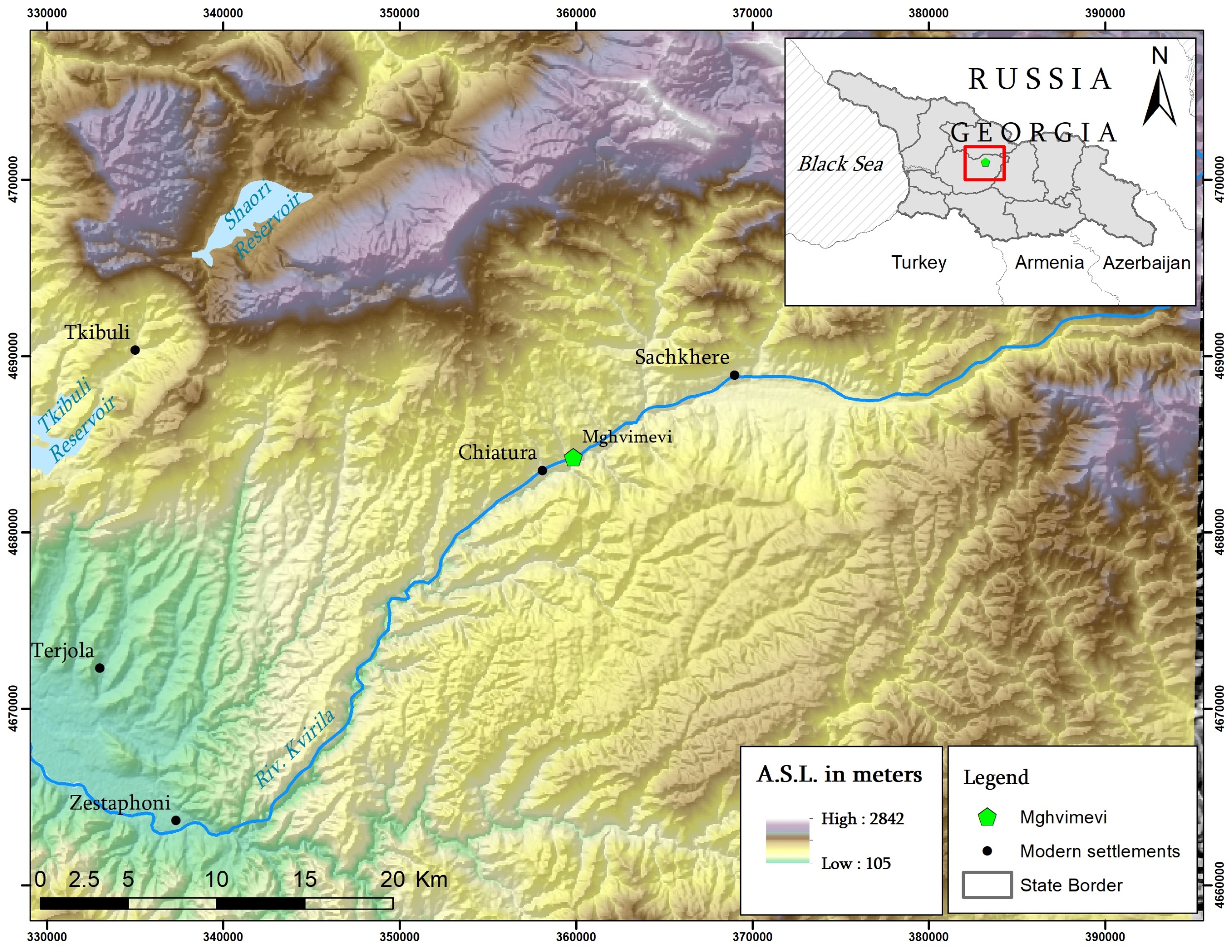 The Mghvimevi cave complex is an archaeological site consisting of two caves and five rock shelters located in western Georgia, in the Chiatura municipality, within the Kvirila River gorge, at an elevation of 620 meters above sea level (See Figure 1). The site was initially identified during a survey campaign in 1934, when Sergey Zamyatnin, a fellow of the Institute of Anthropology and Ethnology of the then USSR Academy of Sciences, was dispatched to western Georgia to investigate Palaeolithic sites. At Mghvimevi, Zamyatnin collected Upper Palaeolithic surface material, including 56 flint tools, 89 flint blades and cores. More importantly, he recorded ten engravings in one of the rock shelters (Zamyatnin, 1937).