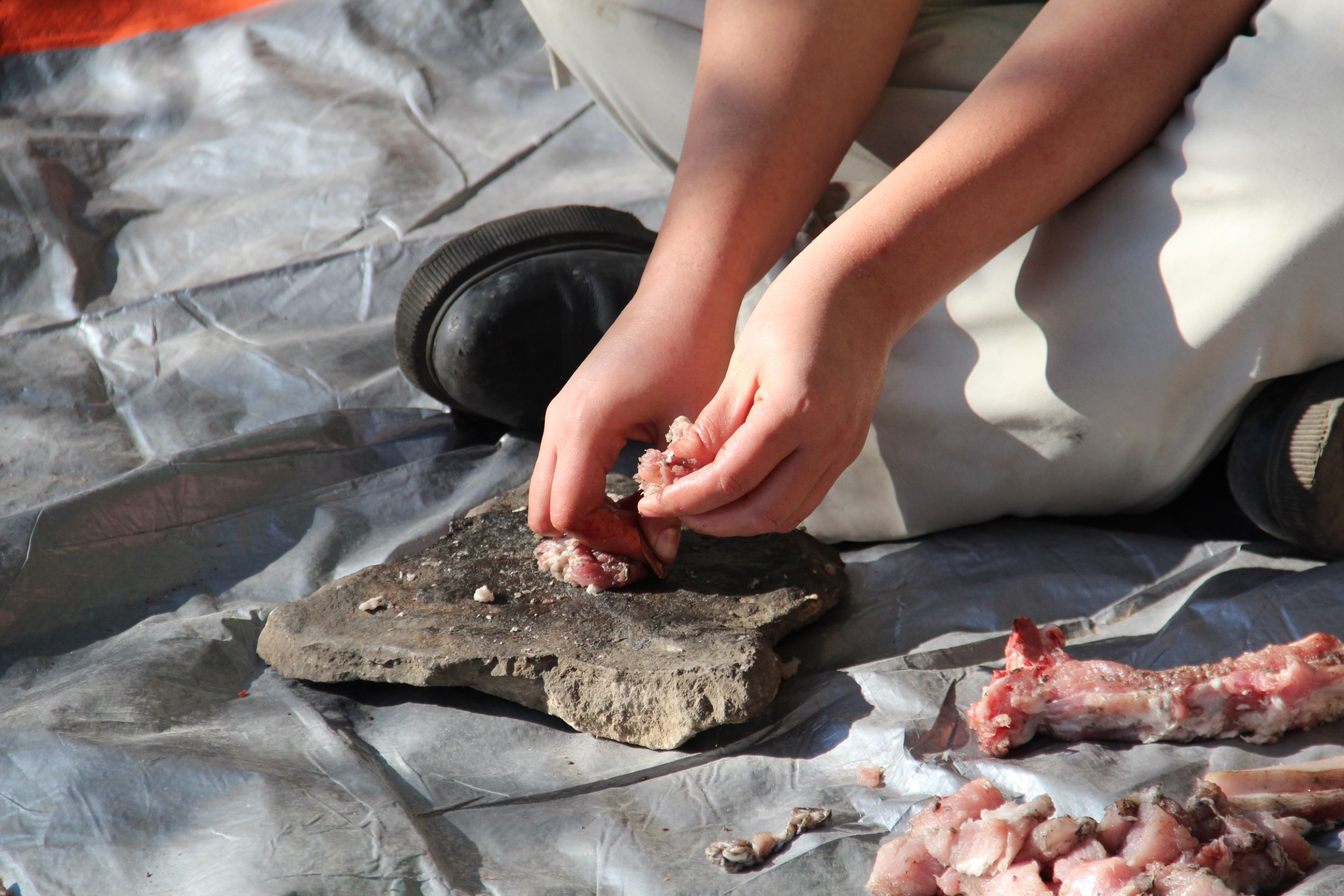 After completing the scraping-cutting experimental series, and prior to microscopically documenting the implemented traces on the cutting boards, the boards were washed with pure cold water and dried in the sun, as meat and skin are fat-rich products and had left the surfaces covered in grease. As a result, the boards were only partially clean, with some fat and grease still remaining.