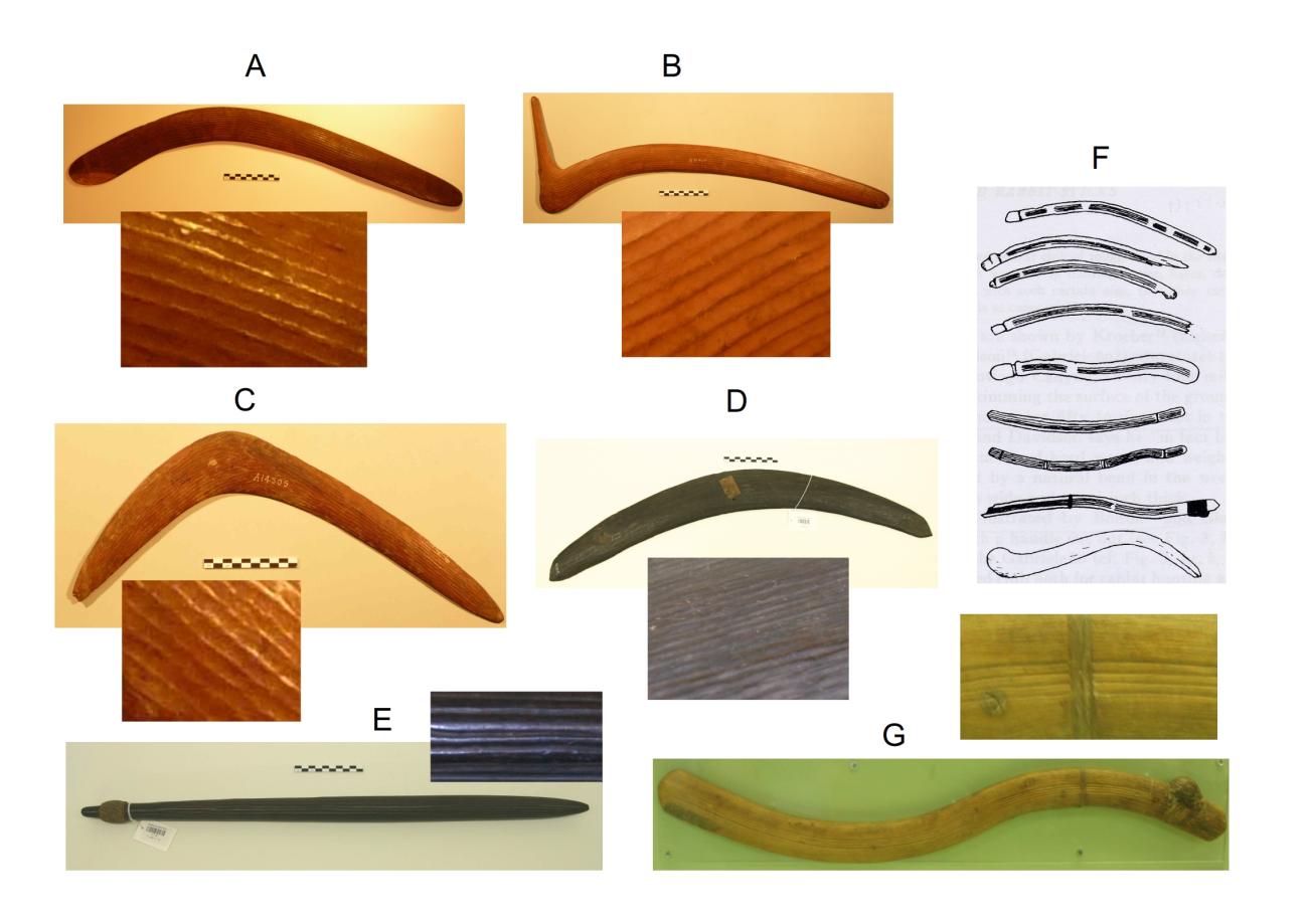 In central Australia, different type of throwing sticks are grooved: The most famous being the kylies (See Figure 2A) and wirlkies2 (See Figure 2B) from the central desert region, which have been diffused through almost all the continent (Davidson, 1936; Jones, 1996). Such a grooved pattern is characterized by 3-5-millimetre-wide shallow flutes (ripple profile) with a 0.2-0.5 millimetre depth, resulting in a density of 2-3 flutes per centimetre, with narrow parts and extremities having a denser pattern. The wideness of these grooves leads them to be classed as flutes or ripple grooves. No symbolic function for this feature has been revealed from ethnographic studies (Jones, 1996). The recognised function of the flutes on kylies of central Australia include the production of rhythmical scraping sound between two throwing sticks (McCarthy, 1961) in addition to their use as clap sticks (Van der Leeden, 1967).