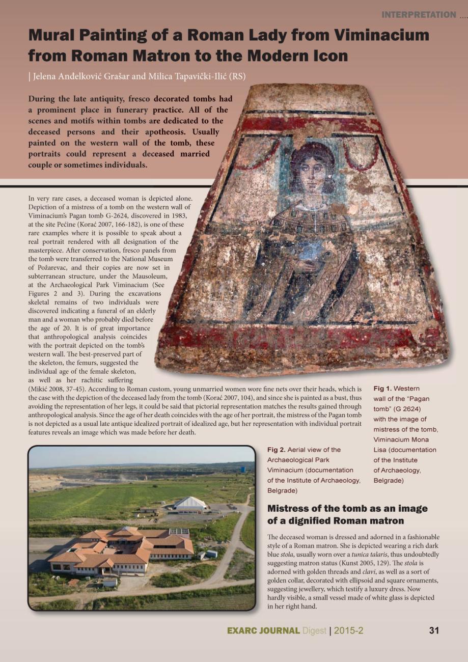 Finally, Mural Painting of a Roman Lady from Viminacium: From Roman Matron to the Modern Icon introduces us to the display of ‘Vinimacium Mona Lisa’, copy of a fresco from Pagan tomb G-2624, discovered in 1983 at Pećine.