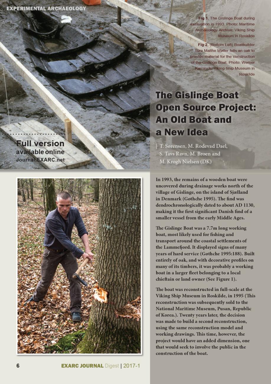 The spring 2017 Digest offers a choice of articles from EXARC Journal issues 2016/4 and 2017/1. One of the articles is The Gislinge Boat Open Source Project: An Old Boat and a New Idea. The Gislinge Boat Open Source Project was designed as a combination of maritime craftsmanship, experimental archaeological research, digital communication, education and outreach activities. In doing so it wanted to explore to what extent the public could be involved with the experimental archaeological boatbuilding process. The whole project was inspired by the open source concept: the idea that information and knowledge should be shared freely and openly, an ideal fully shared by EXARC. We are proud to have Dael and Sørensen from the Viking Ship Museum in Roskilde (DK) as one of our Keynote Lectures in Leiden (NL) at the 10th International Experimental Archaeology Conference, EAC10.