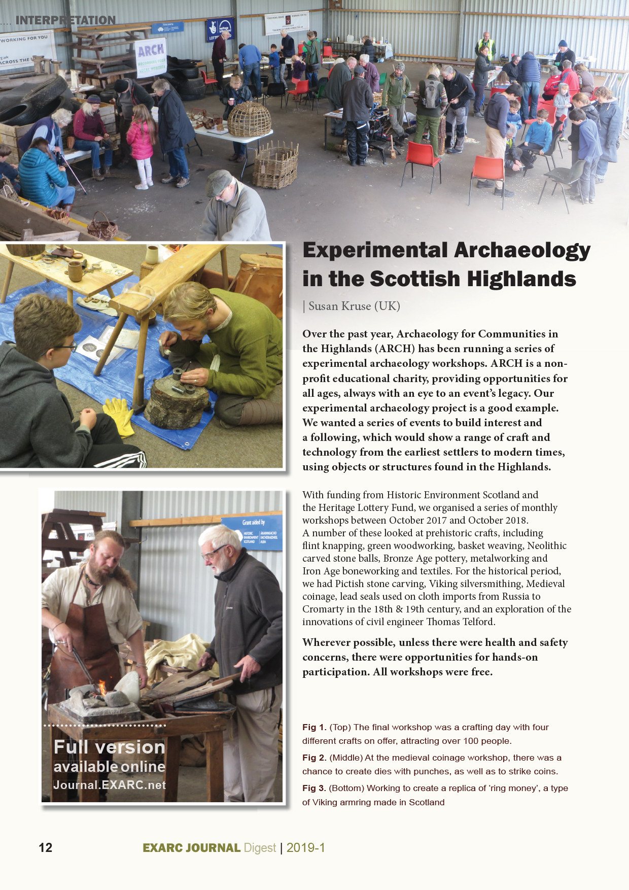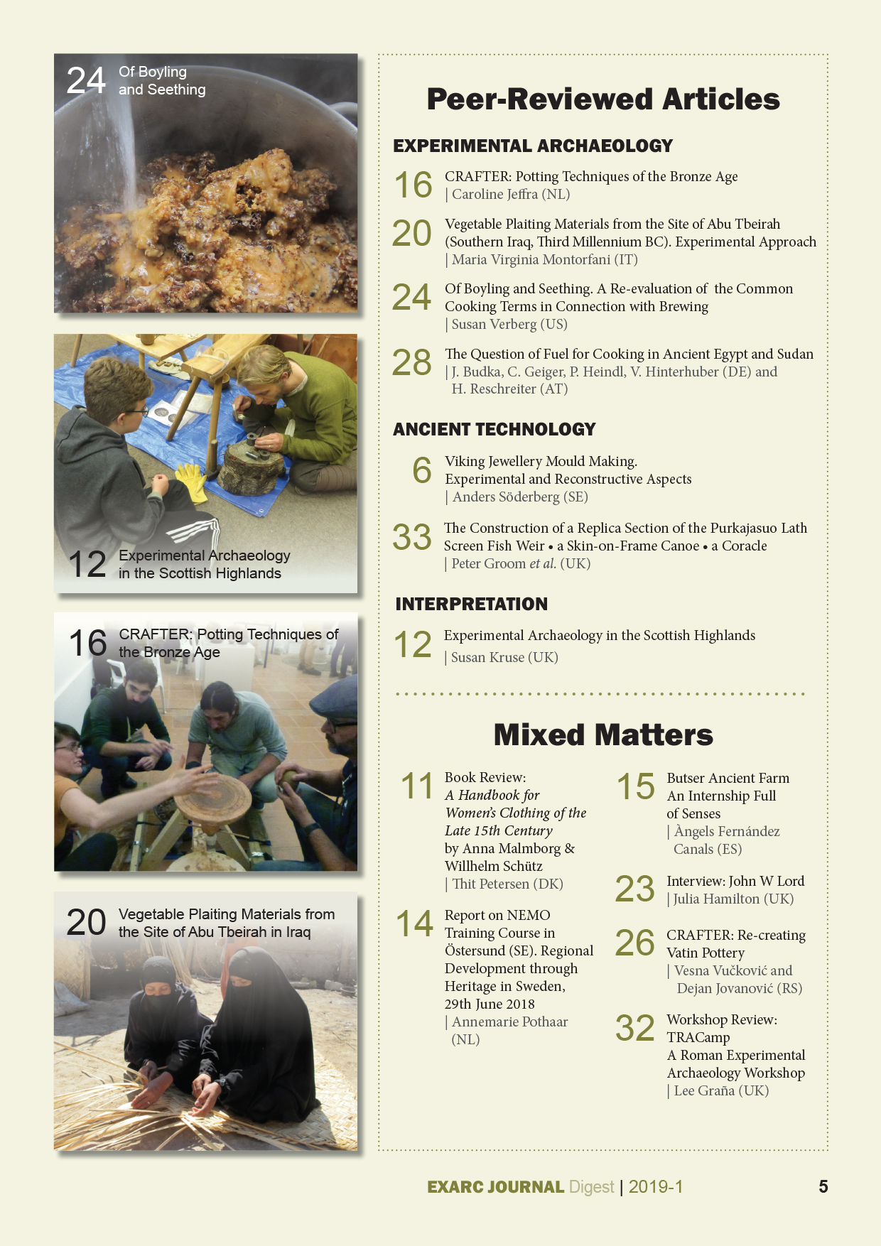 The last two issues of our Journal received many interesting articles of which only a few can be sampled in this Digest. The articles range widely from an insightful article on Viking Jewellery Mould Making by Anders Söderberg through to an exhaustive overview of pottery techniques in Bronze Age Europe with suggestions for further experiments by Caroline Jeffra. In between there is an article outlining the detective work needed to interpret two 14th century mead recipes by Susan Verberg. The personal favourite of our Editor-in-Chief was Experimental Archaeology in the Scottish Highlands by Susan Kruse. This article introduces a series of experimental archaeology workshops organised by Archaeology for Communities in the Highlands which combined archaeological experiments with educational activities. Not only did they attempt and succeed in reaching audiences who might otherwise not be interested in archaeology, they are also making what they learned further available through videos and loan boxes.