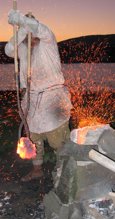 The advantage is that there is usually minimal damage to the furnace, which remains fully ignited if secondary working heats of the bloom are required. The negative aspect is that this work is done reaching down inside, while standing directly over, the blazing hot furnace. (Although this process is quite spectacular to the viewing audience!)