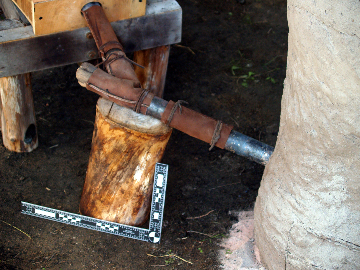 Air blast must be constant, even a stoppage of as short as 3 to 5 minutes is likely to catastrophically drop temperatures, freezing the slag and resulting in an unrecoverable failure. An experienced bellows operator will be able not only to maintain consistent volumes over time, but also control working pressure of the blast. Too little pressure behind the blast and the air will not penetrate into the centre of the furnace. The result is a small and/or lacy bloom. Viking Age blacksmith’s bellows are often not able to produce the air volumes required. A simple measuring method is to time how long it takes the bellows to fill a large plastic garbage bag of known volume.