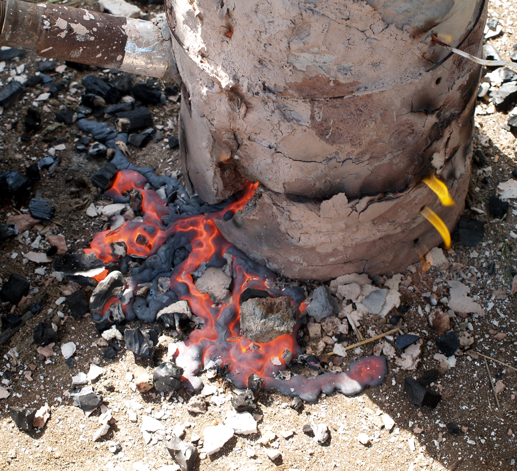 The production of slag depends on a combination of character of the clay, silica content of the ore and the exact layout of the furnace. Sometimes the furnace will self tap through small cracks in the walls (incontinent7 ). The sound of the air through the tuyere is of critical importance here. A reduction of sound means partial blockage of the tuyere, by congealed slag. This must be quickly knocked off by inserting a small diameter metal rod down the Y tube. A thumping / bubbling sound indicates that the slag bath has risen so high as to soon ‘drown’ the tuyere, and a tap must be made to drain the excess. Drain no more than is required, as the slag bath is the working heart of the smelter. Often simply prying open the tap arch is enough to crack the bowl and let the liquid pour out. If not, the metal rod is lightly hammered through the upper side wall of the bowl to form a small hole. Volume of the discharge can be controlled by raking dirt into the path of the flow.