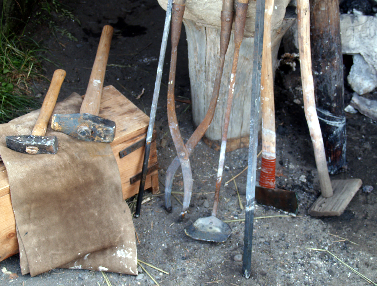 With a top extraction any remaining charcoal is lifted out of the furnace, using a long handled scoop to expose the top of the liquid slag pool. Then a short section of log (10 cm diameter) is used to pound on the top of the bloom inside the hot furnace (Boonstra, van de Manakker and van Dijk 1997)8 . This will partially compact the metal while it still is at welding temperatures, plus partially loosen the bloom from the lower slag bowl. A metal rod with a small hook end is used to fully free the bloom. Special 'bloom tongs' are used to grab out the bloom and transfer it to the waiting anvil.