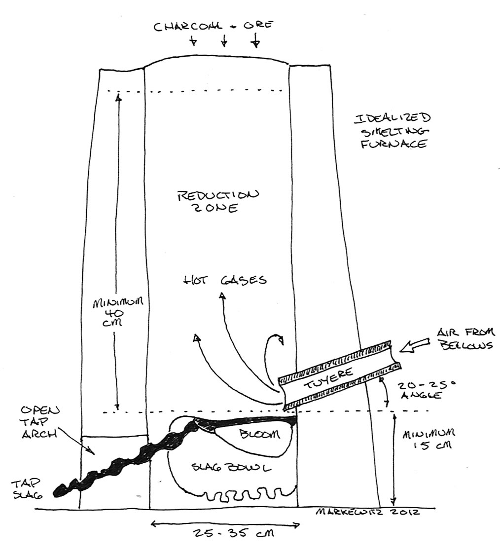 The furnace is a cylinder of clay filled with charcoal, with high combustion temperatures supported by the injection of air into the base of the furnace1 . Once fully ignited, ore is added in small batches, while keeping the shaft filled with charcoal. In simple terms, burning charcoal creates superheated carbon monoxide (CO) gas, which reacts with the iron oxide (Fe2O3) contained in the ore. In effect, the more reactive CO rips off the oxygen, leaving metallic iron behind. This iron is heavier, so it falls to the base of the furnace. A liquid glassy slag also forms, composed of melted furnace wall, silica from the ore, and charcoal ash. Falling to the colder base of the furnace, it congeals, forming a bowl shape. The descending iron particles collect inside the liquid pool of slag within this bowl into the bloom mass. Excess slag may have to be tapped off to prevent blocking the air flow at the tuyere. The bloom is finally extracted while hot, either through the top or bottom side of the furnace, then hammered to consolidate it.