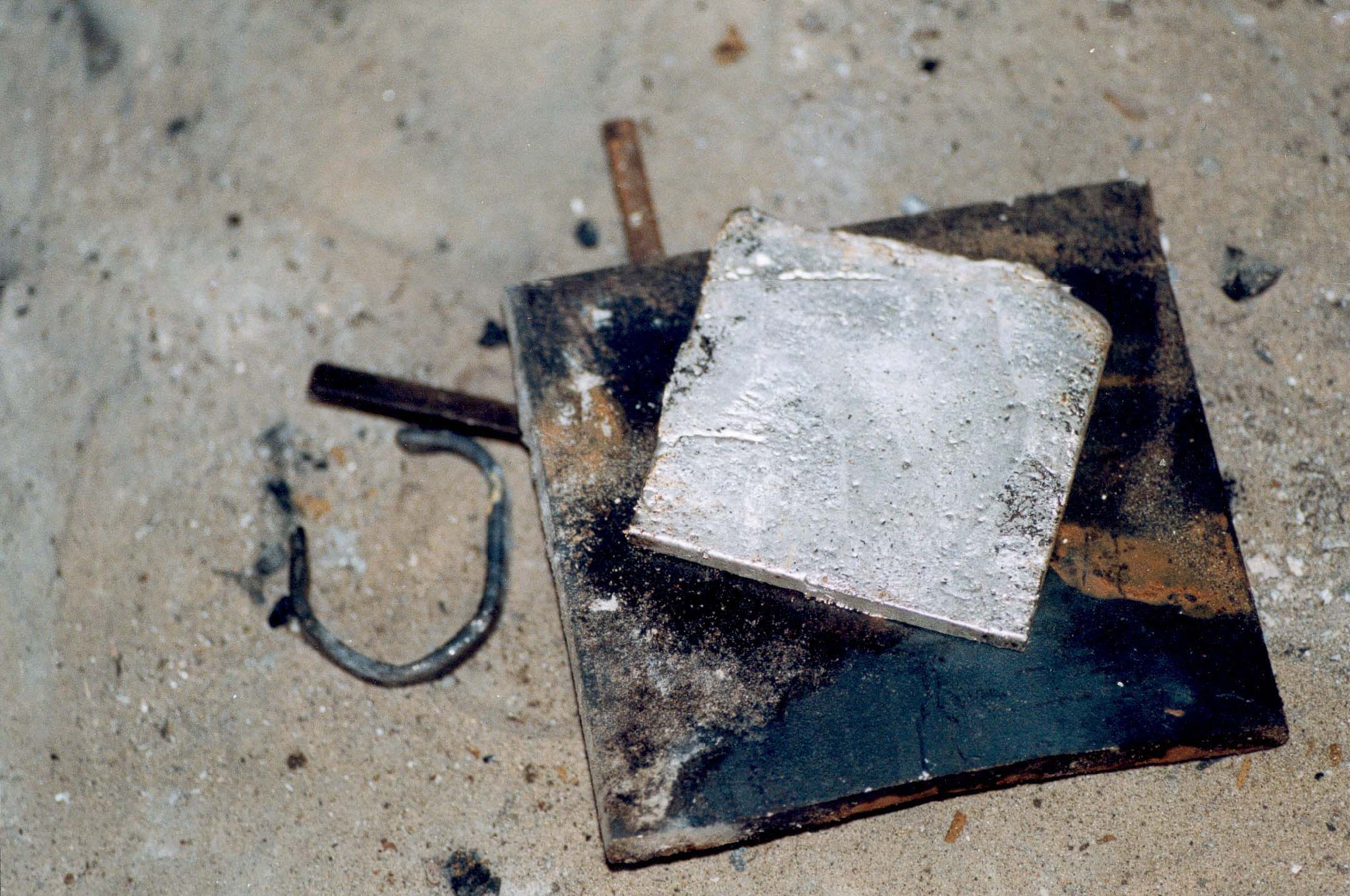 This produced a square slab of silver of about the same size as the first attempt. The upper part was sawn off, again for analysis, and the remaining object was treated in the same way as the first. This time the plate was worked less heavily. After having worked it, the silver was annealed. Hereafter the slab was worked once more in the same way and annealed again. At this stage the workshop in Wilhelminaoord was over; time was up.