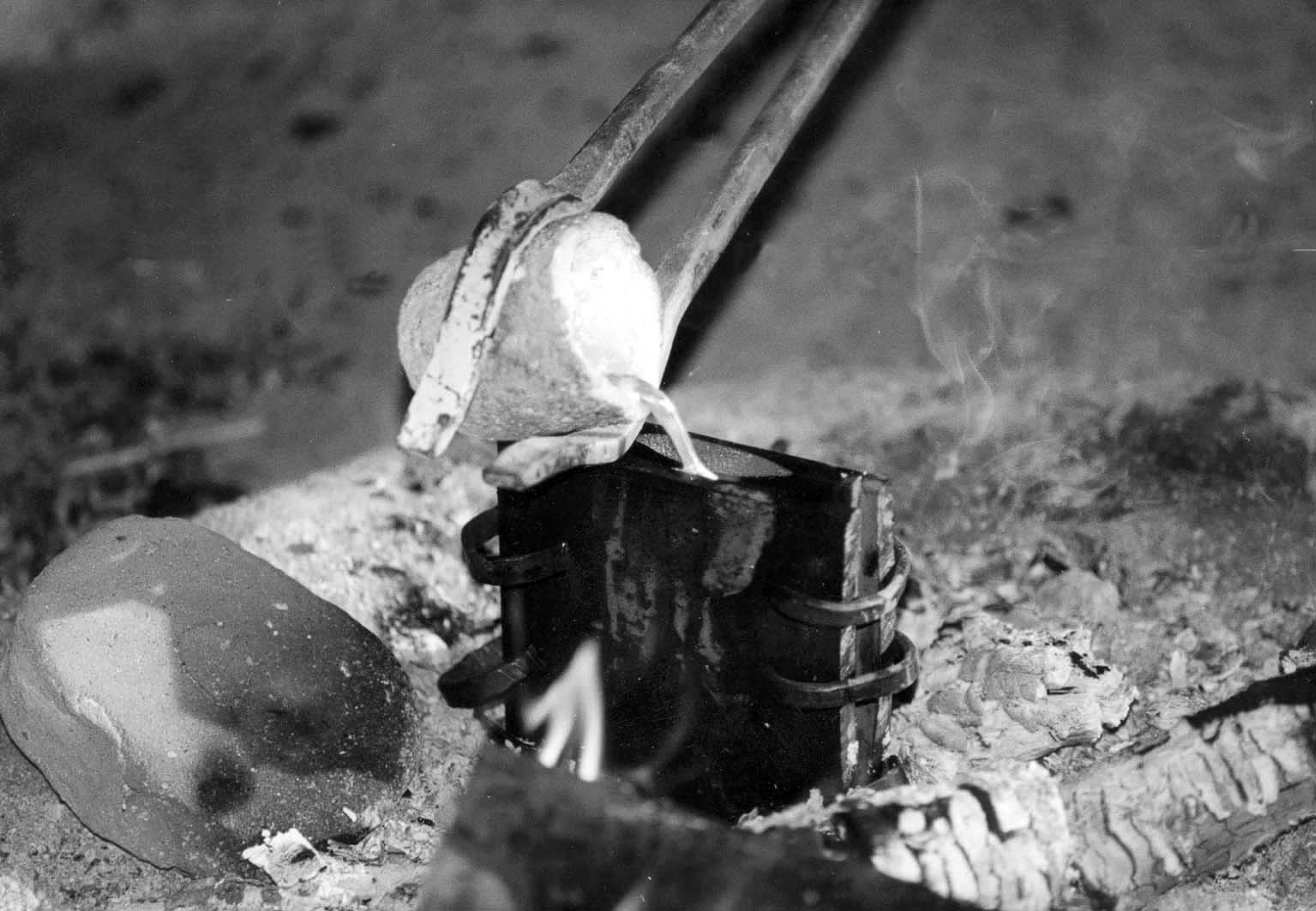 In Wilhelminaoord, there was the possibility to carry out the above discussed experiment. The mould was made in the following manner. Three square iron rods were placed between two thick iron plates with eight iron cramps. To minimise the silver needed for the experiment, the rods were not quite as thick as Cellini would have demanded. The actual diameter was 5 mm. This mould was painted with fluid clay to prevent the silver from seeping through (using a brush of wool bound with grass in a feather socket to stay in the historical context). A tiny crucible was prepared from grey clay, meagred with loam and a handful of pieces of wool according to the instuctions of Biringuccio (Price 1959, 219). This crucible was fired, and after cooling down was rubbed with olive oil. The piece of linen sheet was soaked in the oil as well. A little bit of clay was flattened and this was put on the crucible to keep the charco¬al out and the heat in the crucible. This lid was not treated with oil.