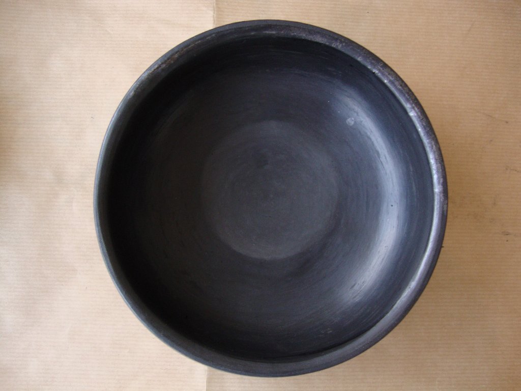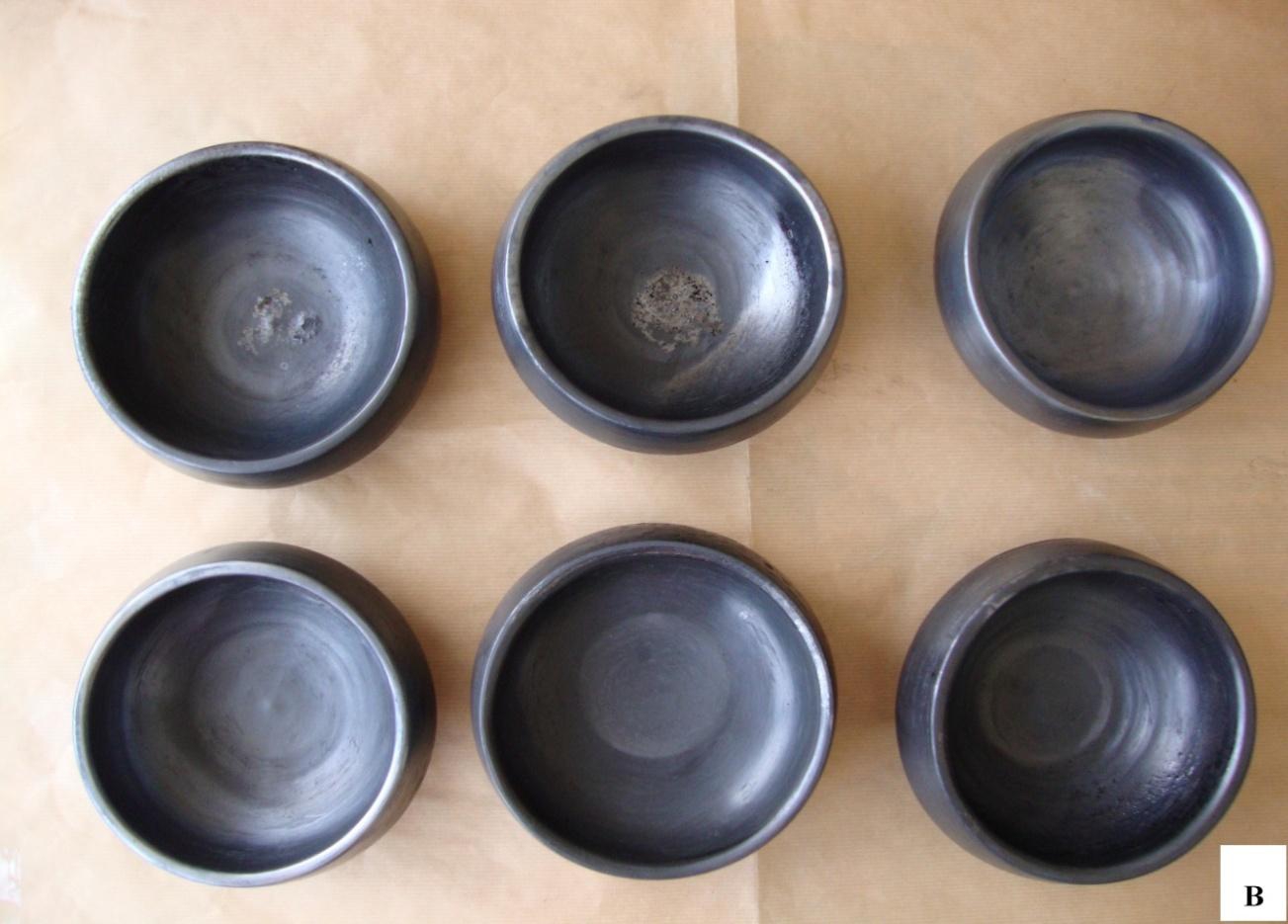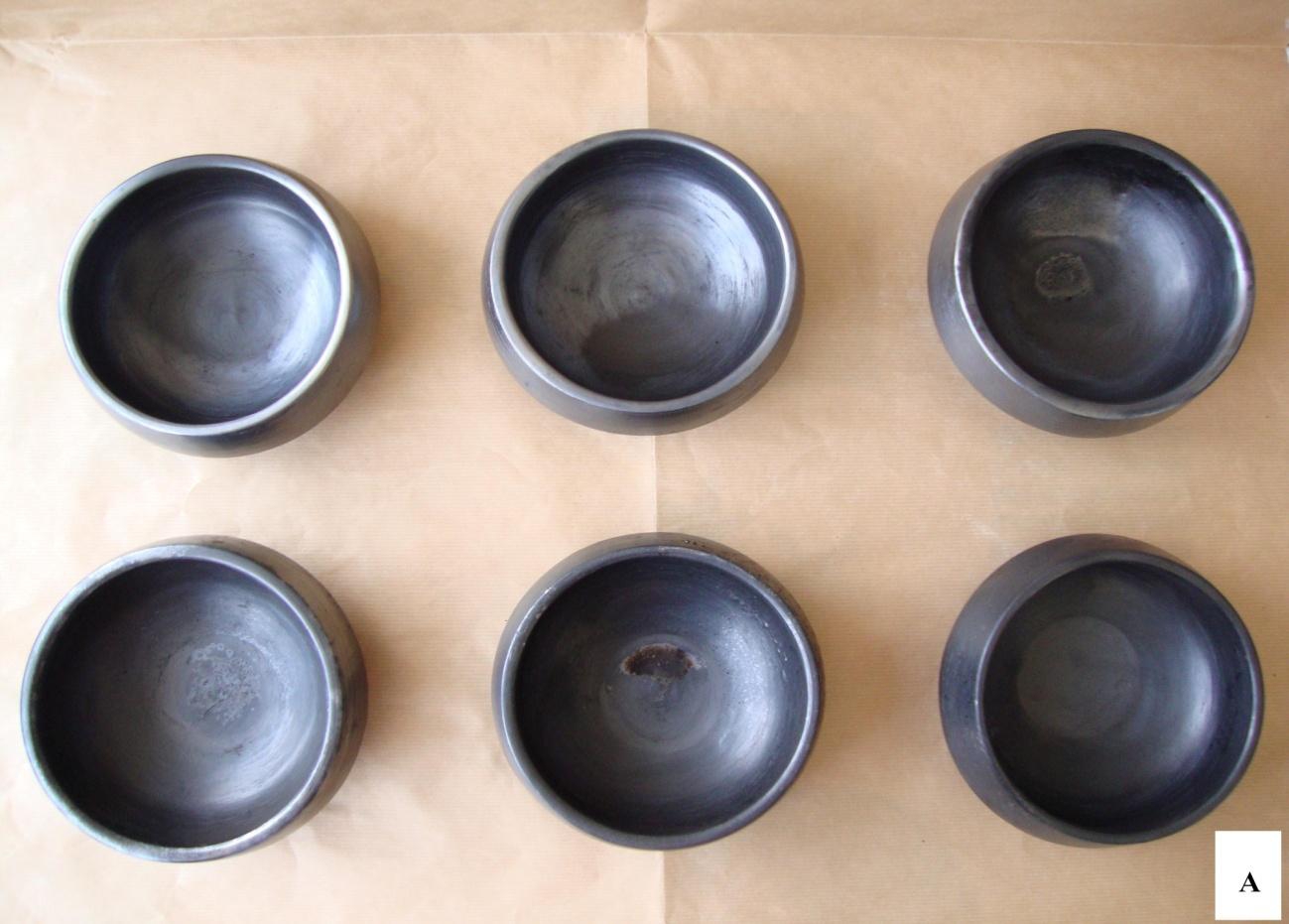 The bowls were a shiny black, and in some cases they were black with silver flecks11 ; this means that pottery similar to Bucchero and silver Bucchero, Bucchero with metallic flecks, was produced (See Figure 6). Afterward I proved their water resistance by an empirical verification: once cooked, I put the bowls in the running water and I noticed that water fast slipped away; impermeability was reached by rubbing the bowls to leather hard by using a stone that, transferring mineral salts on the artefacts surface, obstructed their pores. This showed that the temperature reached inside the smaller box was not less than 700°C / 750°C12 . Almost all the bowls have a dull dark grey circle or a âstacking diskâ on the bottom of the tub (See Figure 7), in correspondence to the kiln firing support foothold; all the bowlsâ feet have a uniform black colouring.
