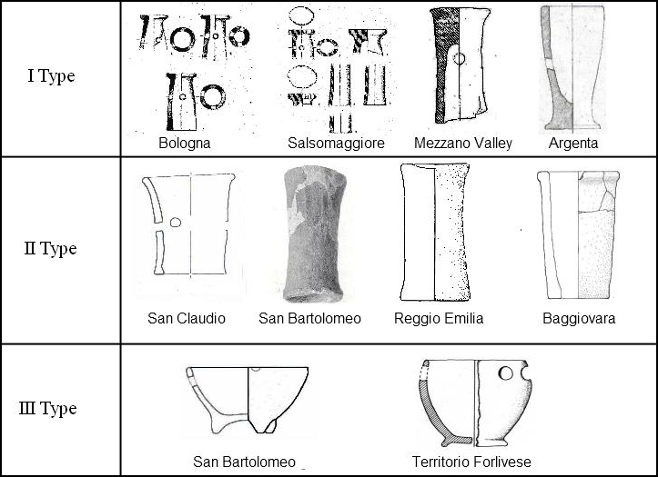 The first type, including technical elements found in the San Vitale necropolis in Bologna (Taglioni 1997, 207-224), in Argenta (BermondMontanari 1993,248-252), in Mezzano Valley (Taglioni 1997,216) and in Salsomaggiore (Taglioni 1997, 215-216), has a cylindrical body with breathing holes and a plain disc on one side and it is datable from tenth to eighth century BC. The second type, formed by technical elements found in Verucchio (Gentili 1987, 257-258), in San Claudio (Malnati, Losi 1990, 87-125), Baggiovara-Martiniana route (Zamboni 2003-2004, 114), San Bartolomeo-Case Bigi (Patroncini1970, 88-89) and some elements which are part of the Municipal Museum of Reggio Emilia (Damiani, Maggiani, Pellegrini, Saltini, Serges 1992, 344), has an hollow cylindrical body without a proper plain disc, but with lips slightly expanded and breathing holes. This type is datable from the late ninth century until the sixth century BC and is comparable with the supports found in the Palaeoveneto kiln in Crosare di Bovolone (Salzani 2002, 178), used to cook big pots upside down. The third type, including technical elements found near ForlĂŹ (Von ElesMasi1982, 262-263), in San Bartolomeo-Case Bigi (Damiani, et al. 1990, 141-145) and in Baggiovara-Martiniana route (Zamboni 2003-2004, 114), has a vase shaped body with breathing holes and it is datable from the sixth century to the first half of the fifth century BC. There are several interpretations made by scholars about this technical elementâs function and, although I believe that only an experimental approach could prove their aim, it seems that elements included in the first and the second group were used to cook big pots upside down. Then it is possible that supportsâ aim varied according to the their use, inside the firing chamber with slotted platform could be used to support big vases; when pots were in direct contact with fuel, supports were used to keep artefacts separated from coals.