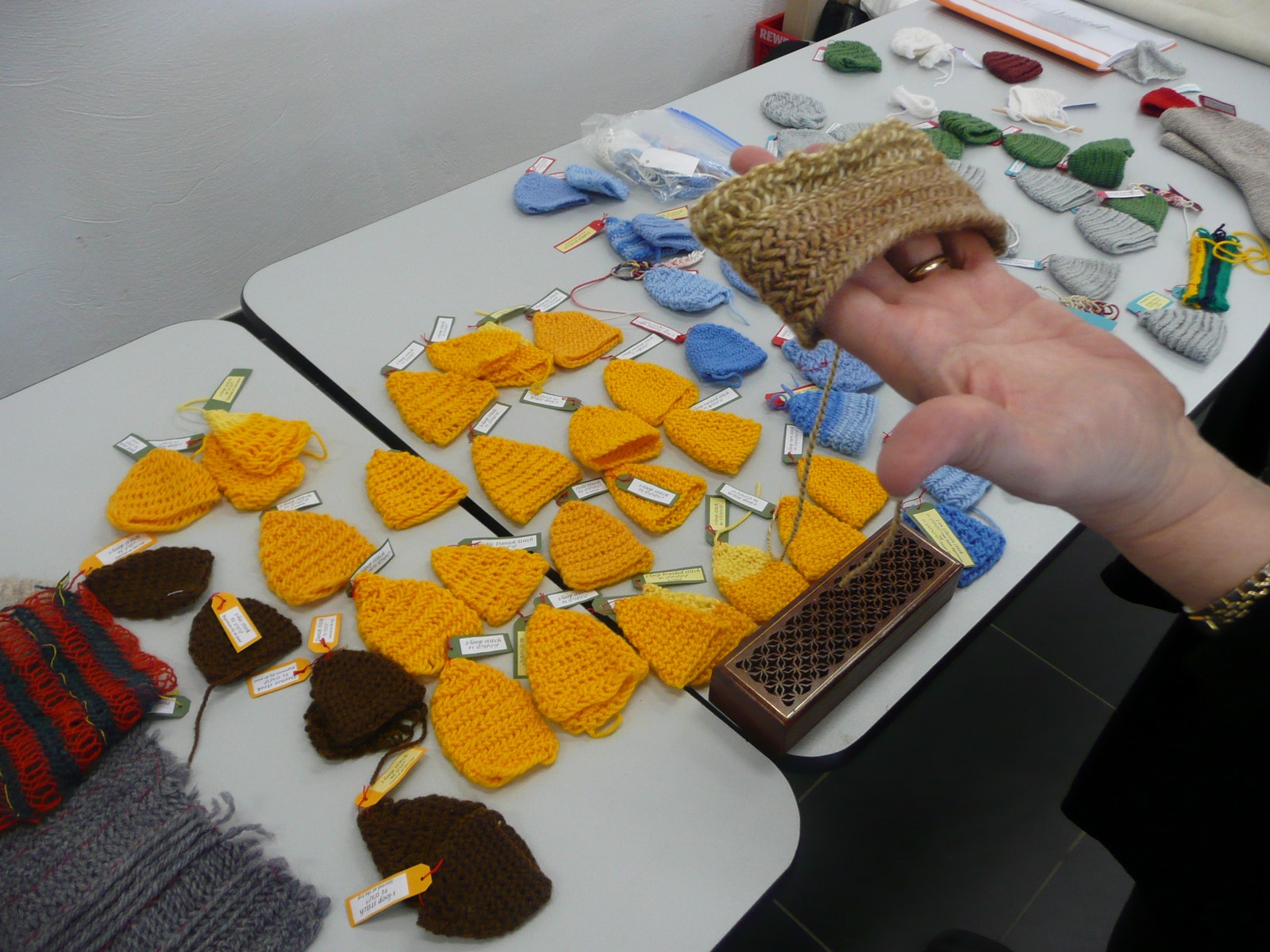 Micky Schoelzke and Ruth MacGregor presented a practical history of silk manufacture, including a hands-on workshop in de-gumming cocoons and reeling silk. Without practical experience, it is not always possible to fully understand a technique, including its advantages, limitations and the time it takes, and therefore, this was a very informative session. Jane Malcolm-Davies explored knitted caps and the development of knitting in the early modern era. Some participants had volunteered to attempt to recreate caps before the conference, so there was comparison and discussion about their results. Aislinn Collins presented about felted caps in Ireland and invited delegates to join her in a felt-making workshop, with assistance from Sabine Ringenberg.