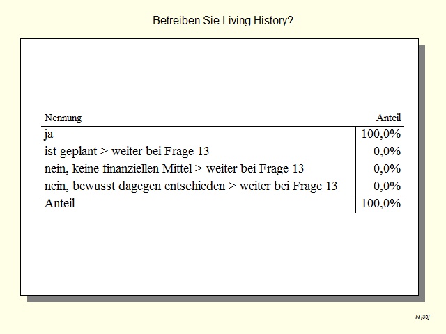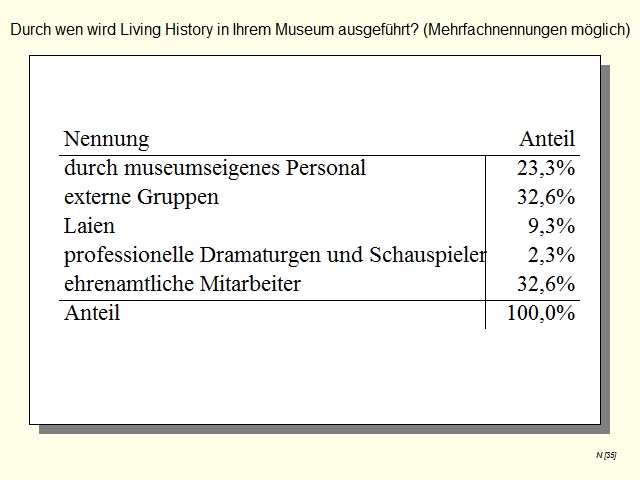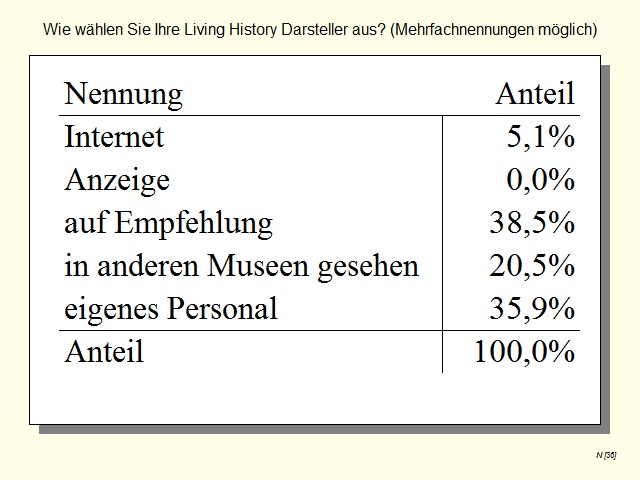 The study has shown conclusively that Living History is a topical issue and is a method that is widely used in German archaeological open-air museums. At the same time there is also the need to act with respect to quality control to ensure that intangible cultural heritage is experienced through Living History in a professional manner, thus protecting the practice. The survey serves to investigate the point at which archaeological open-air museums in Germany are with regard to Living History.