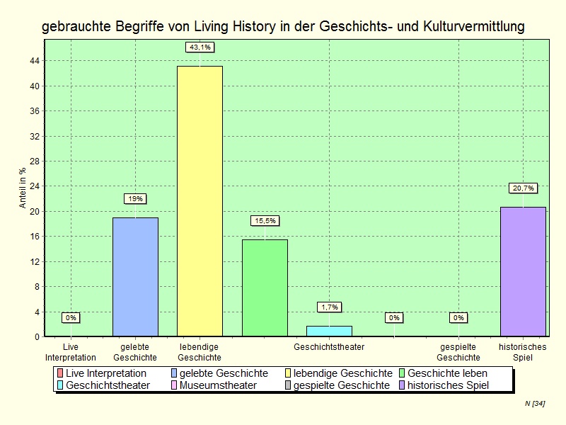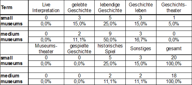 Since the term Living History continues to trigger debate among experts, it was asked if other terms were used in the place of Living History at the museums. It is striking that for both large and small museums the use of other terms was common. While the distribution among small museums is more uniform, there is a concentration of specific terminology in larger museums. Half of the large museums used "living history". Some large museums also used "live history" (Geschichte Leben), "living history" (Lebendige Geschichte) and "historical game" (Historisches Spiel). One quarter of small museums used "living history" and another 25% used "historical game". Phrases like "Live Interpretation", "Museum Theater" and "Played History" (Gespielte Geschichte) are not used.