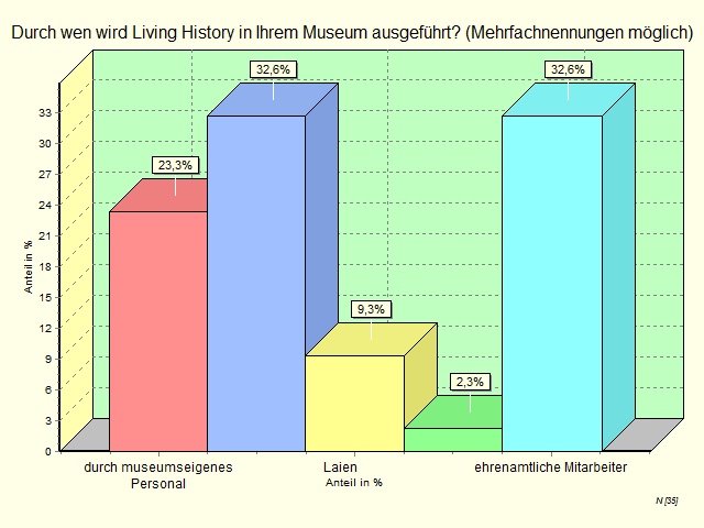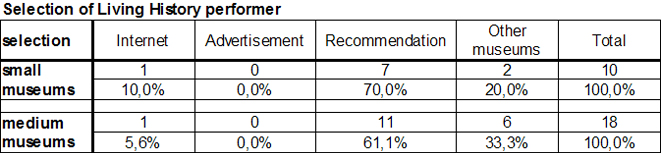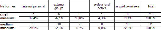 The most significant difference in responses to the question regarding who performs Living History was seen in terms of the number of museum staff. Significantly more large than small museums reported that Living History is carried out by the museum with its own staff. For both small and large museums, volunteers most commonly performLiving History. Large museums often use external groups. Both types of museums hire non-professionals for Living History.