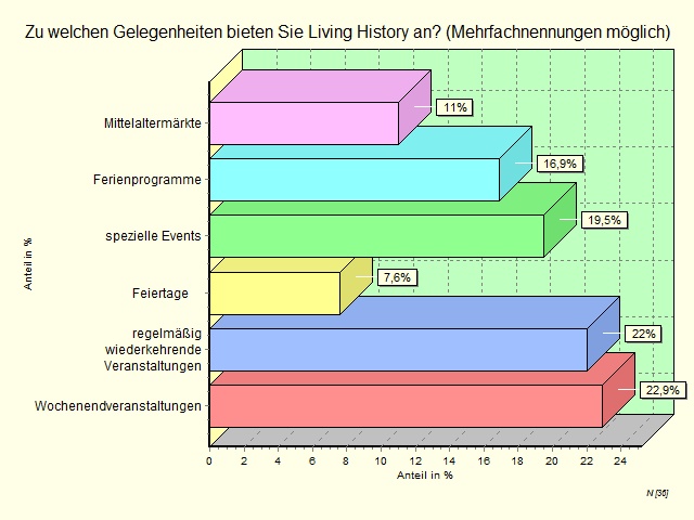 Survey results indicated that the size of the museum has little to no effect on the time period Living history represents, the words used to describe Living History; the occasions when Living History is offered; the target group; the form in which Living History is available and finally who performs Living History.