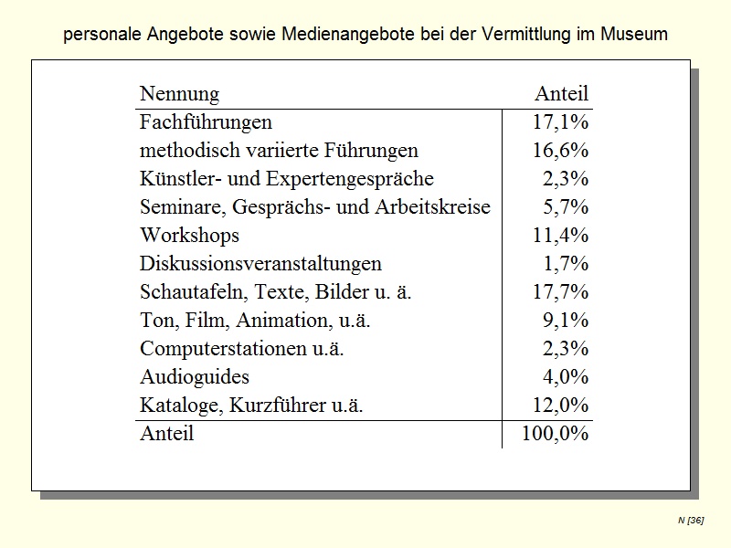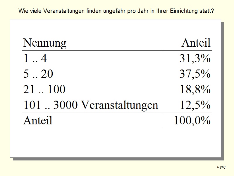 Since the entire population of archaeological open-air museums in Germany, (85 institutions) was surveyed, the dataset constitutes a full census; however, the response rate was 42,4%.2 The questionnaire was analysed with the statistical program Grafstat 3