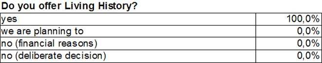 Participants were also questioned as to whether there are events with notably positive responses and experiences in terms of Living History. Repeatedly, something that was discussed here was âparticipatory events", such as "archery", and "touch and try" events. All respondents said that they were getting very positive responses to their contributions. Respondents also had an overwhelmingly positive experience when engaging stakeholders in open dialogue.