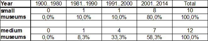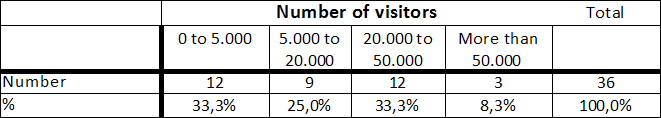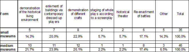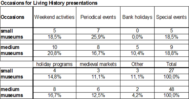 Museum directors and heads of educational departments of the archaeological open-air museums were asked 15 questions on various topics. Some questions considered more general subject matters, for example the annual number of visits, educational programmes at the museums, and defining employees in terms of full-time, part-time and volunteer staff. Furthermore, there were asked specific questions about the design, the form and the specific audience of Living History, as well as the selection of the performers. For the purpose of analysis, participating museums were divided based on average annual numbers of visitors; small museums (5,000 visits), small to medium museums (5,000-20,000 visits), medium museums (20,000 â 50,000 visits) as well as major museums (more than 50,000 visits). The study investigated in detail two groups of museums (discerned by annual visitor numbers) using comparative analysis to elaborate how small museums are set up in comparison to medium museums.