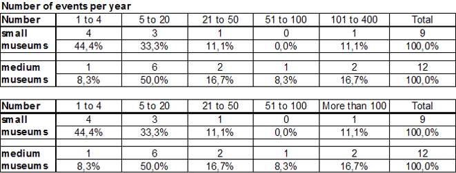In terms of the question regarding the number of annual Living History events, results showed that almost half of the small museums held 1 to 4 events a year. Slightly less than half held between 5 and 20 events, and one museum held between 100 and 140 events. Exactly half of the large museums indicated that between 5 and 20 events had taken place annually. Only a few large museums held 1 to 4 events.