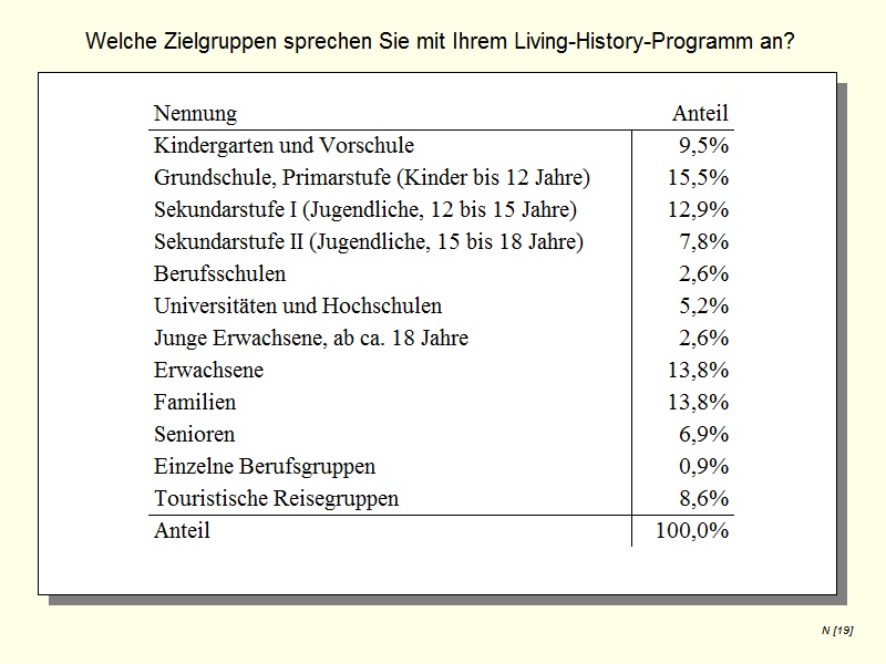 It is remarkable/striking that all of the responding museums offered Living History as an interpretation tool. Thereby it does not matter whether the museum is small or large. Various craft techniques are demonstrated. In addition, structures are enlivened with costumed reenactors and demonstrations of historical lifeways. Some museums stated that they offer scenic tours and courses on traditional crafts. The target group analysis revealed that archaeological open-air museums often offer specific Living History programmes for schools, especially primary school and secondary school. Furthermore, families are the most important target group who receive tailored programmes using Living History.