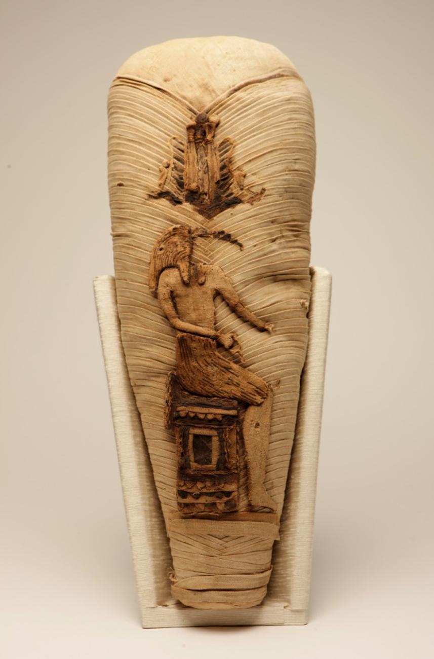 Animal mummies produced as votive offerings for dedication to the gods demonstrate a remarkable array of wrapping styles and decorative features. These range from plain monochrome shrouds to elaborate designs constructed from multi-coloured linen strips arranged to form geometric patterns. Artistic conventions such as applique, modelled forms and painted features give the bundles a more ‘life-like’ appearance, therefore enhancing their appeal to the animal god to whom they were offered (Price, 2015, p.21).