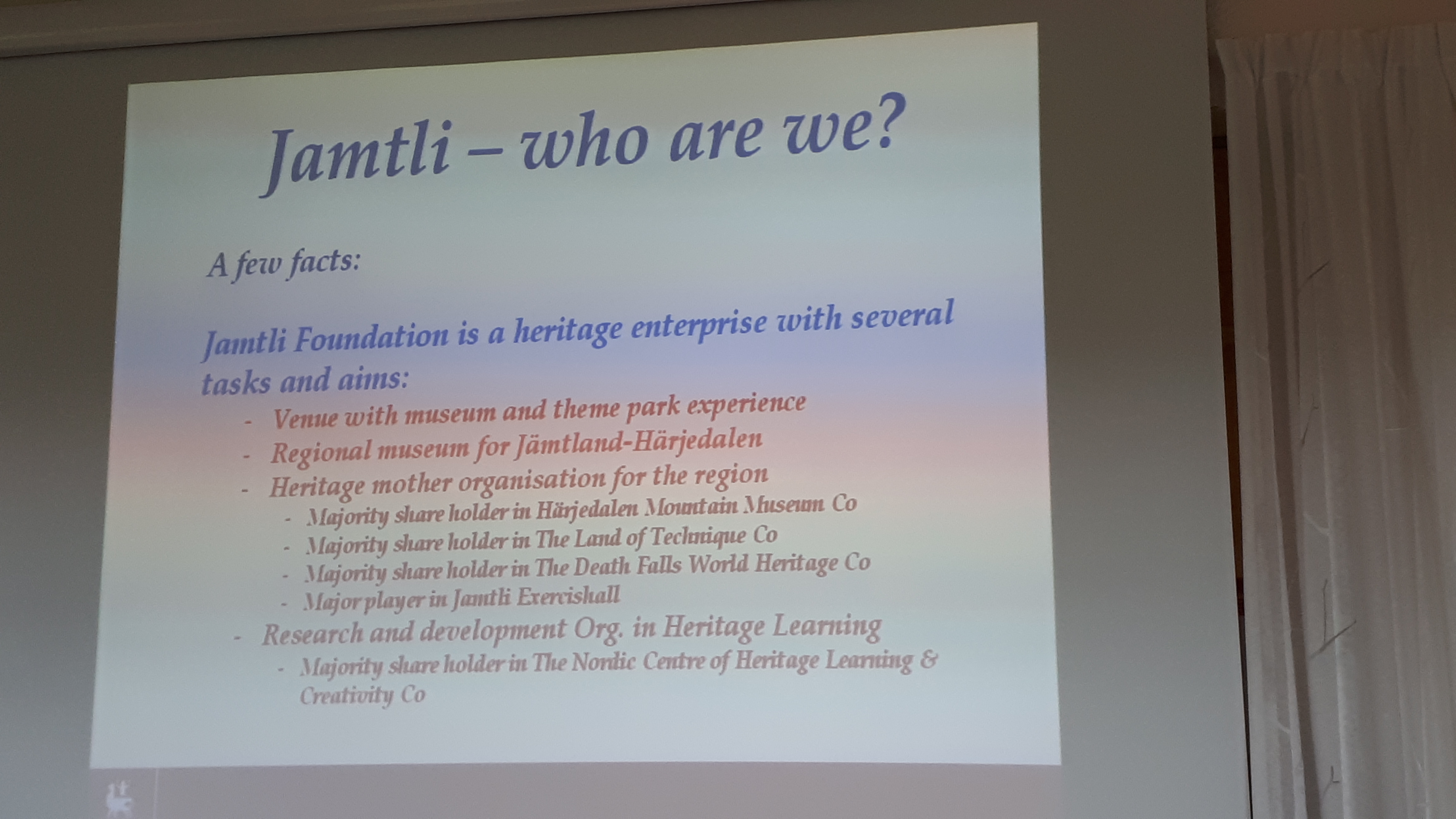 In the late afternoon several of Jamtli Foundation and NCK’s projects were presented in which their methodology of ‘pressure cooker’ with ten questions to define yourself and ‘creative labs’ to combine arts, crafts and new business opportunities were very notable. Research has shown that this area in Sweden is mostly dependant on the tourism tradition of sports and nature, and that the cultural tourism side is not that mature. But, for potential visitors, culture and heritage are the main reasons for choice destination. This calls for a redefinition of tourism and the tourist as co-creative actors forming their own experience. In other words, from sight-seeing to sight-doing. NCK provides a sound research base and practical methodologies to develop new cultural and heritage programming and products. Jamtli Foundation, by the nature of how the organisation is set up, helps spread this knowledge through various regional organisations by providing staff and experience in broad fields.