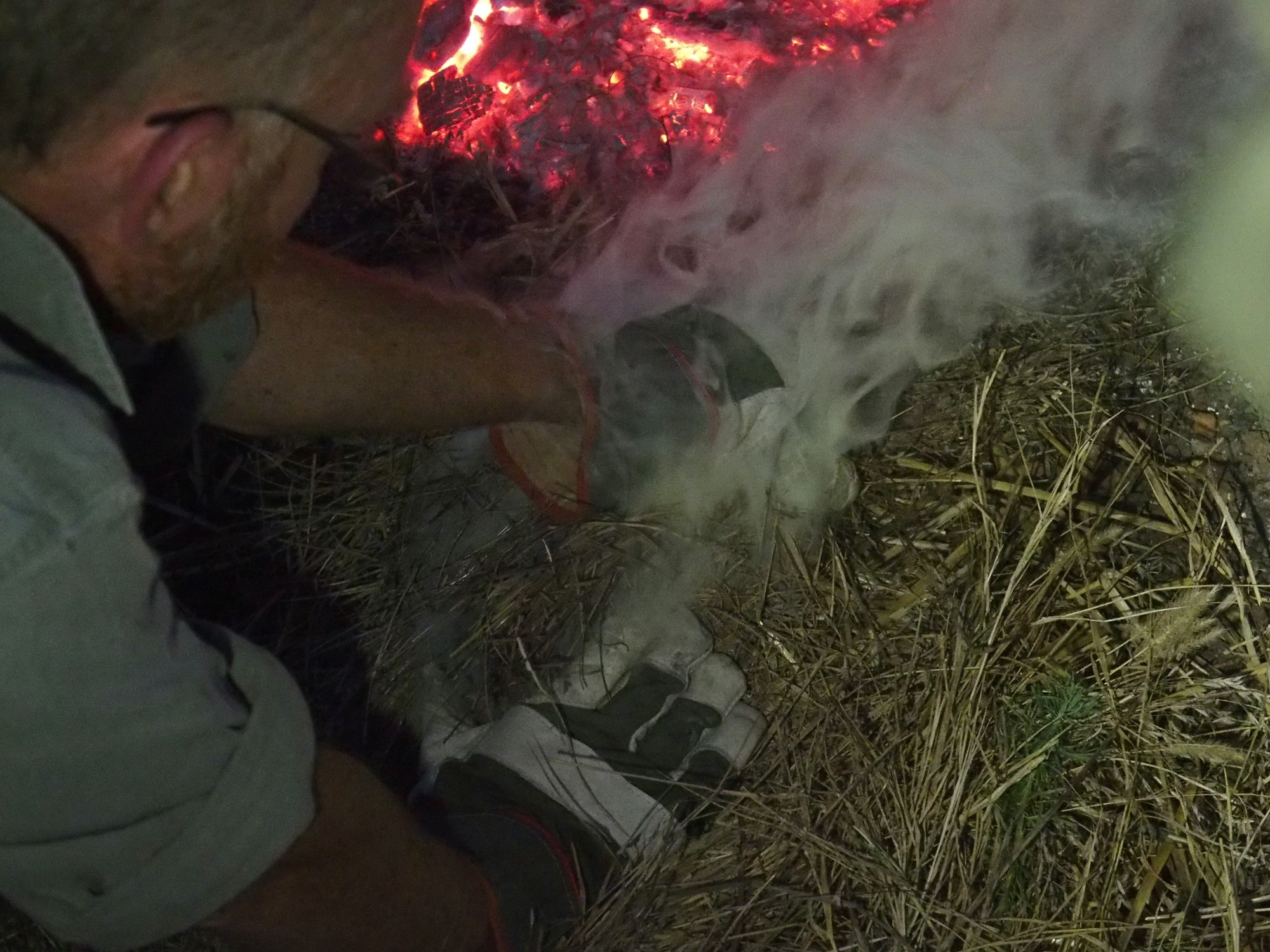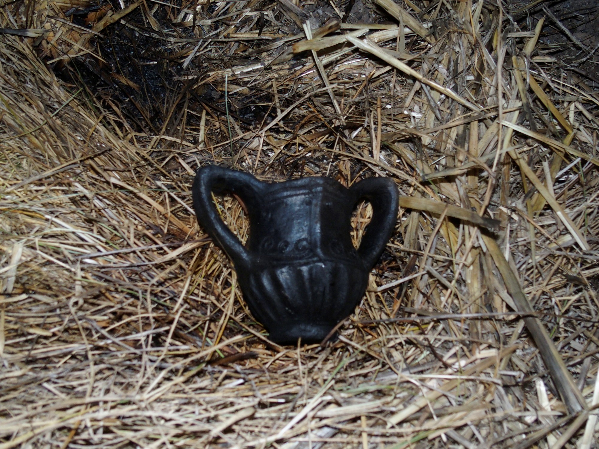 In order to achieve a black surface on the pots (See Figure 11), we implemented the Japanese raku technique. This means that a candescent item has been removed from fire, covered by straw and isolated from air influence for few minutes (See Figure 10). Considering that this method of vessel colouring might produce burned toxic materials, the pot was submerged into water in order to remove them from the surface.
